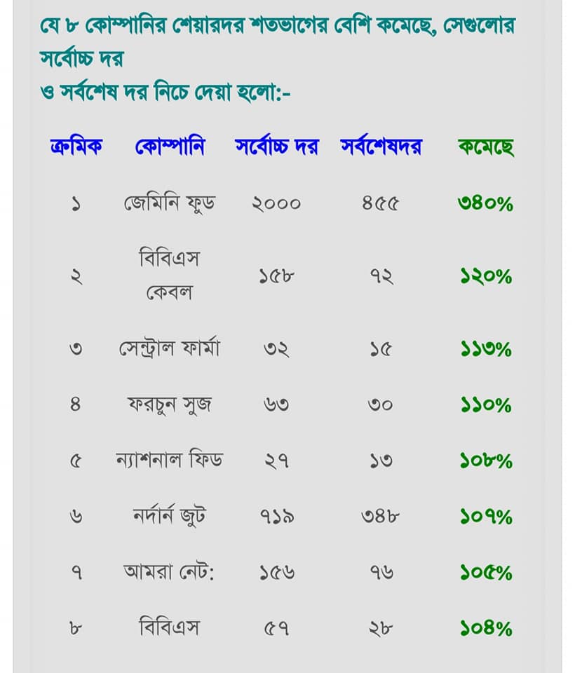দর বিপর্যয়ের ৮ কোম্পানি : প্রাপ্ত তথ্যমতে, পুঁজিবাজারে তালিকাভূক্ত ৩৪৩টি কোম্পানির মধ্যে (৩৭ মিউচ্যুয়াল ফান্ডসহ) যে ৮ কোম্পানির শেয়ারদর শতভাগের বেশি কমেছে, সেগুলোর মধ্যে জেমিনি সী ফুডের দর কমেছে ৩৪০ শতাংশ, বিবিএস কেবলসের ১২০ শতাংশ, সেন্ট্রাল ফার্মার ১১৩ শতাংশ, ফরচুন সুজের ১১০ শতাংশ, ন্যাশনাল ফিডের ১০৮ শতাংশ, নর্দার্ন জুটের ১০৭ শতাংশ, আমরা নেটওয়ার্কের ১০৫ শতাংশ এবং বিবিএসের ১০৪ শতাংশ। এছাড়া, লভ্যাংশ কমে যাওয়া এবং মুনাফা কমে যাওয়ায় ব্যাংক ও লিজিং খাতের অনেক কোম্পানির শেয়ার দরেও ব্যাপক পতন হয়েছে।