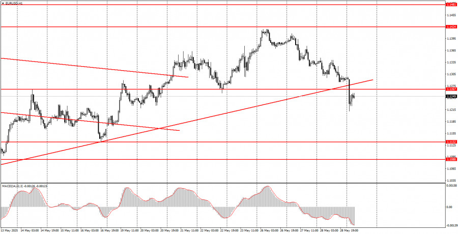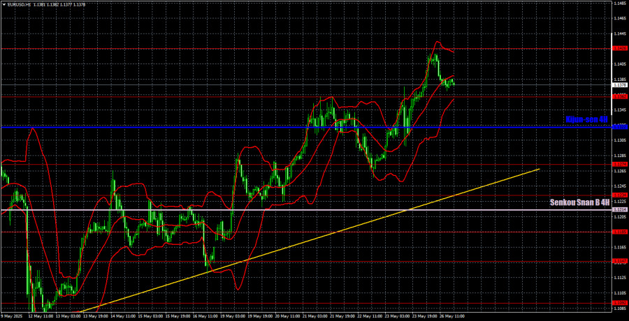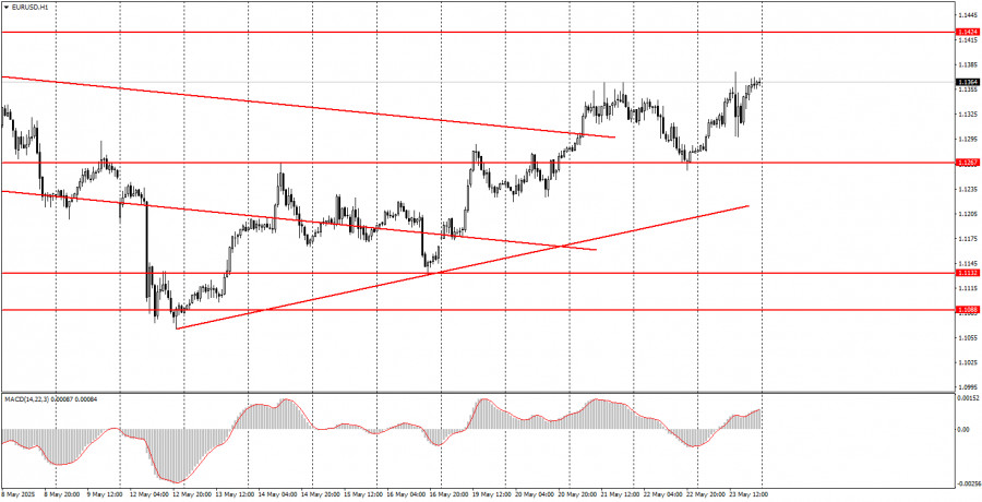 মঙ্গলবারের ট্রেডের বিশ্লেষণ EUR/USD পেয়ারের 1H চার্ট মঙ্গলবার EUR/USD কারেন্সি পেয়ারের মূল্যের নিম্নমুখী মুভমেন্ট অব্যাহত ছিল, যা সোমবার থেকেই শুরু হয়েছিল। মঙ্গলবার রাত থেকে বুধবার ভোর পর্যন্ত মার্কিন ডলারের দর আরও বৃদ্ধি পেয়েছে; তবে এতে খুব একটা আনন্দিত হওয়ার কিছু নেই। ডোনাল্ড ট্রাম্প ইউরোপীয় ইউনিয়নের ওপর ১ জুন থেকে শুল্ক বৃদ্ধির সিদ্ধান্ত প্রত্যাহার করে নেওয়ায় ডলারের ওপর ইতিবাচক প্রভাব পড়ে। তবে মনে করে দেখুন, যখন যুক্তরাষ্ট্র ও চীন ১১৫% শুল্ক হ্রাসে সম্মত হয়েছিল, তখনও ডলার অল্প সময়ের জন্য শক্তিশালী হয়েছিল — কিন্তু তা দীর্ঘস্থায়ী হয়নি। গতকাল প্রকাশিত ডিউরেবল গুডস অর্ডার সংক্রান্ত প্রতিবেদনও মার্কিন ডলারকে কিছুটা সমর্থন প্রদান করে, কারণ এটির ফলাফল প্রত্যাশার তুলনায় কম হতাশাজনক ছিল। ফলে টানা দুই দিন ধরে ডলারের মূল্য বৃদ্ধি পেয়েছে, তবে এটিকে কোনোভাবেই বিগত চার মাসের ঊর্ধ্বমুখী প্রবণতার সমাপ্তি বলা যাবে না। টেকনিক্যাল দৃষ্টিকোণ থেকে, ঘণ্টাভিত্তিক টাইমফ্রেমে এখনও এই পেয়ারের মূল্যের ঊর্ধ্বমুখী প্রবণতা অটুট রয়েছে। ট্রেন্ডলাইন এবং 1.1267 লেভেল থেকে রিবাউন্ড হলে আবারও ঊর্ধ্বমুখী মুভমেন্ট শুরু হতে পারে।