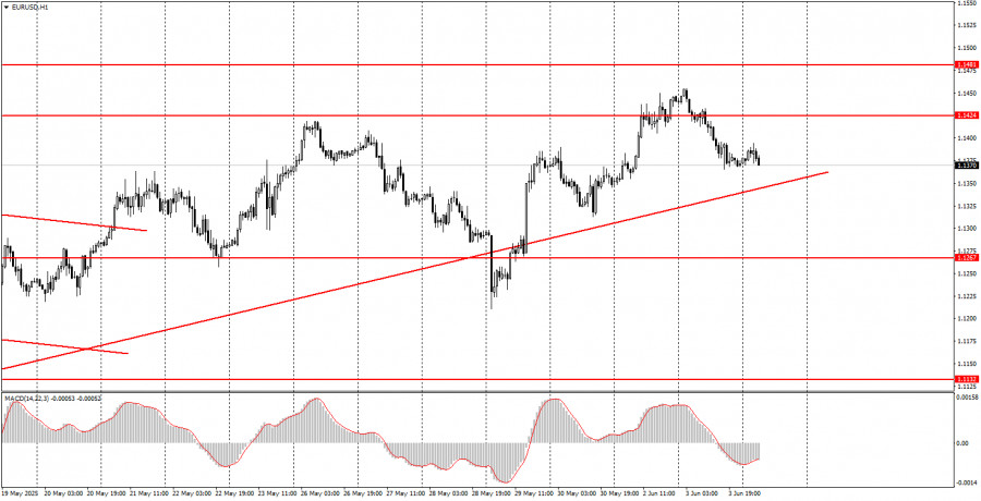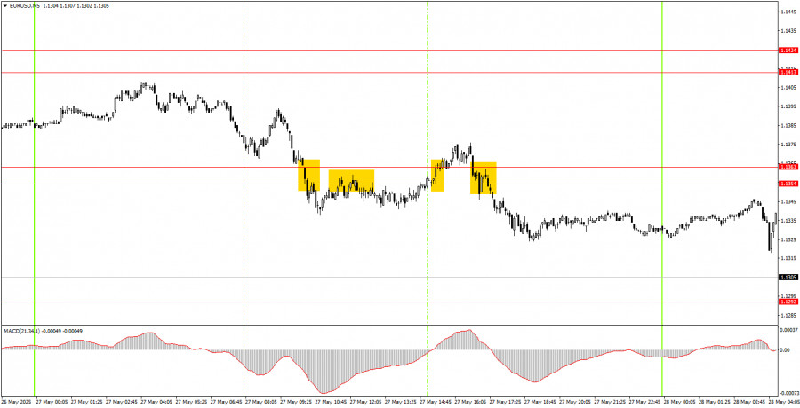 EUR/USD পেয়ারের 5-মিনিটের চার্টের বিশ্লেষণ ১ জুন থেকে ইউরোপীয় পণ্যের ওপর শুল্ক ৫০% পর্যন্ত বাড়ানো হবে ট্রাম্পের এই ঘোষণার পর সোমবার দিনের শুরুতে EUR/USD কারেন্সি পেয়ারের মূল্য ঊর্ধ্বমুখী হয়। তবে, ইউরোপীয় কমিশনের প্রেসিডেন্ট উরসুলা ভন ডার লায়েনের সঙ্গে আলোচনার পর ট্রাম্প শুল্ক বৃদ্ধির সিদ্ধান্ত পিছিয়ে ৯ জুলাই করার ঘোষণা দিলে, এই পেয়ারটি পরে আবারও দরপতনের মুখে পড়ে। ট্রাম্প ও ভন ডার লায়েনের ভাষ্যমতে, কার্যকর আলোচনা ও সমঝোতায় পৌঁছাতে পাঁচ সপ্তাহই যথেষ্ট সময়। আমাদের মতে, "সমঝোতা" মানেই যে ইতিবাচক কিছু হবে তা নয় — তবে এক মাস দেড় মাসের মধ্যে বোঝা যাবে, আদৌ যুক্তরাষ্ট্র ও ইউরোপীয় ইউনিয়নের মধ্যে কোনো বাণিজ্য চুক্তি স্বাক্ষর করা সম্ভব কি না। এখানে উল্লেখযোগ্য বিষয় হলো, ইইউ সহজে চাপের মধ্যে পড়তে চাচ্ছে না, তবে তুলনামূলকভাবে নমনীয় অবস্থান বজায় রেখেছে। ইউরোপ ট্রাম্পের সঙ্গে সংঘাতে যাওয়ার ব্যাপারে সতর্ক অবস্থানে রয়েছে এবং তার শক্তিশালী অবস্থানের স্বীকৃতিও তারা দিয়েছে। তবে, ইউরোপ যেকোনো শর্ত মেনে নিতে প্রস্তুত নয়। সুতরাং আলোচনায় মতৈক্যে পৌঁছানো কঠিন হবে বলেই ধরে নেওয়া যায়, কিন্তু চুক্তি স্বাক্ষরের সম্ভাবনাও একেবারে উড়িয়ে দেওয়া যায় না। সমস্যা হলো, এই আলোচনার প্রায় কোনো তথ্যই গণমাধ্যমে আসছে না, তাই পরবর্তী দেড় মাস মার্কেটের ট্রেডাররা শুধু অনুমানই করে যাবে আলোচনা কতটা অগ্রসর হচ্ছে। এই পরিস্থিতি ডলারের মূল্যের আরও অস্থিরতার ইঙ্গিত দিচ্ছে। ট্রেডাররা বারবার নতুন করে ডলারের শর্ট পজিশন ওপেন করছে, আবার ট্রাম্পের হঠাৎ মত পরিবর্তনের কারণে পরদিনই তা ক্লোজ করতে বাধ্য হচ্ছে — এসব করতে করতে তারা ক্লান্তি বোধ করছে। কেউ কেউ শর্ট পজিশন ক্লোজ করছে না — আবার সবাই সবসময় করছে না। এমনকি মৌলিক কোনো কারণ ছাড়াও মার্কিন ডলার এখনো প্রবল চাপের মুখে রয়েছে। সোমবারের ট্রেডিং সিগন্যালের বিষয়ে বলতে গেলে — তেমন উল্লেখযোগ্য কিছু দেখা যায়নি। এই পেয়ারের মূল্য কোনো লেভেল বা লাইন টেস্ট করেনি। ইউরোপীয় সেশনে মূল্য 1.1426 লেভেলের খুব কাছাকাছি এসেছিল, তবে সেখানে পৌঁছায়নি।
