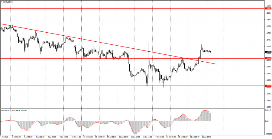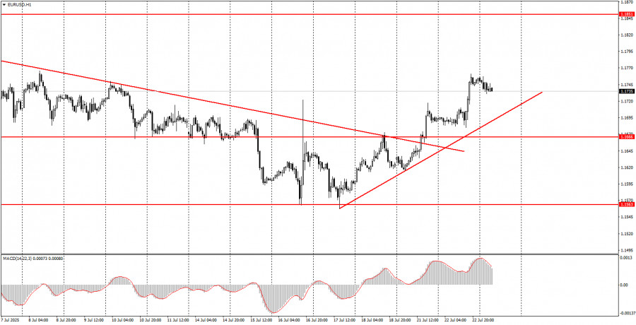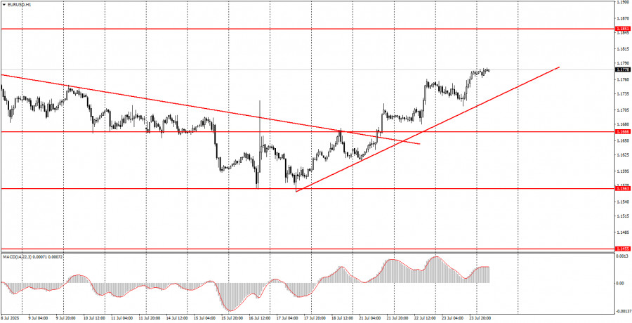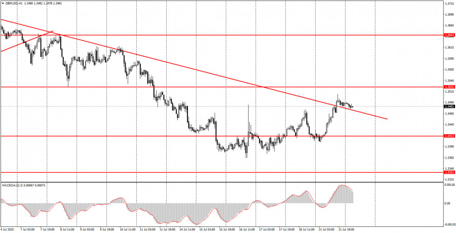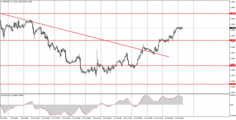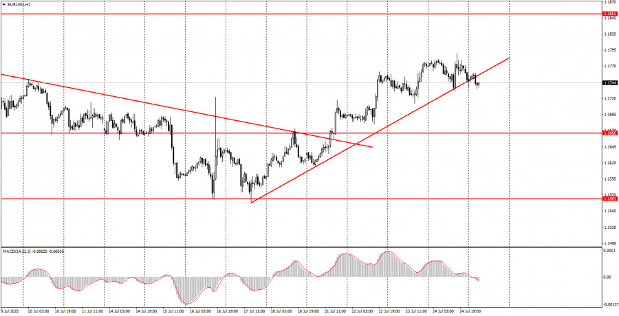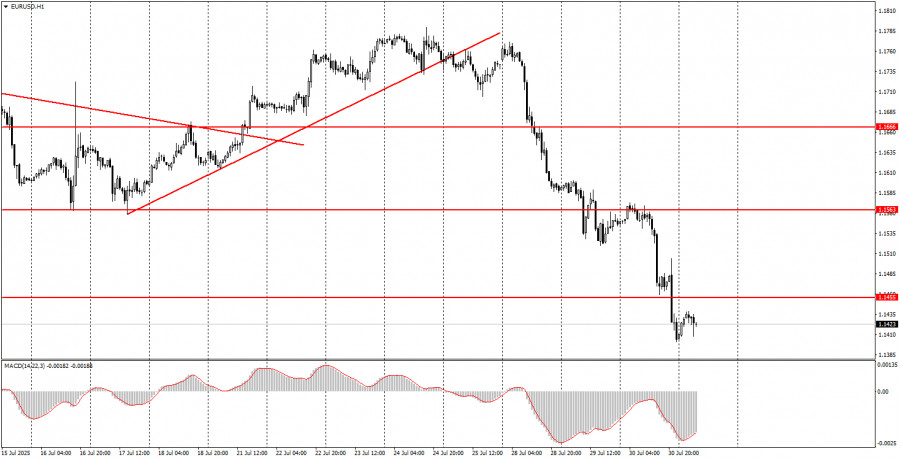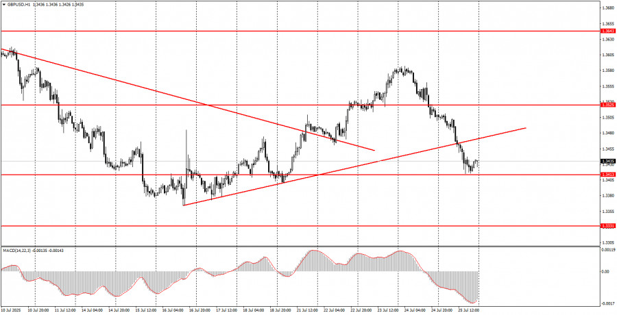 ফান্ডামেন্টাল ইভেন্টের বিশ্লেষণ: বৃহস্পতিবার কোনো গুরুত্বপূর্ণ ফান্ডামেন্টাল ইভেন্ট নির্ধারিত নেই, কারণ দিনের মধ্যে কোনো গুরুত্বপূর্ণ বক্তব্য নির্ধারিত নেই। গত রাতেই জেরোম পাওয়েল পরিষ্কার করে দিয়েছেন যে, ডোনাল্ড ট্রাম্পের আক্রমণাত্মক মন্তব্য তাকে প্রভাবিত করে না এবং ফেডারেল রিজার্ভ হয়তো বছরের শেষ নাগাদ কেবল একবারই সুদের হার কমাতে পারে। বাণিজ্য যুদ্ধই এখনো বিনিয়োগকারীদের মূল উদ্বেগের বিষয় হিসেবে রয়ে গেছে এবং এটি সোমবার থেকে নতুন রূপ ধারণ করেছে। আমরা এখনো মনে করি, যেকোনো বাণিজ্য চুক্তি যাতে শুল্ক বহাল থাকে, সেটিও আসলে "ভিন্ন রূপে বাণিজ্য যুদ্ধ" হিসেবেই বিবেচিত হওয়া উচিত। ইউরোপীয় ইউনিয়নের সঙ্গে স্বাক্ষরিত চুক্তির মতো চুক্তিগুলো যুক্তরাষ্ট্রের পক্ষে ইতিবাচক। তাই, এ ধরনের প্রতিটি নতুন চুক্তিই ডলারের আরও দর বৃদ্ধির সম্ভাবনা বাড়াতে পারে। তবে বৃহত্তর ও মৌলিক দৃষ্টিকোণ থেকে ট্রেডাররা এখনো নতুন বাণিজ্য কাঠামো এবং ট্রাম্পের সুরক্ষাবাদী নীতিমালাকেই গুরুত্ব দিচ্ছে। আমাদের দৃষ্টিতে, এ ধরনের মৌলিক পটভূমি দীর্ঘমেয়াদে ডলারের দর বৃদ্ধির জন্য উপযুক্ত নয়। সুতরাং, আমরা এখনো মনে করি দৈনিক টাইমফ্রেমে কেবল একটি নিম্নমুখী কারেকশন হচ্ছে।