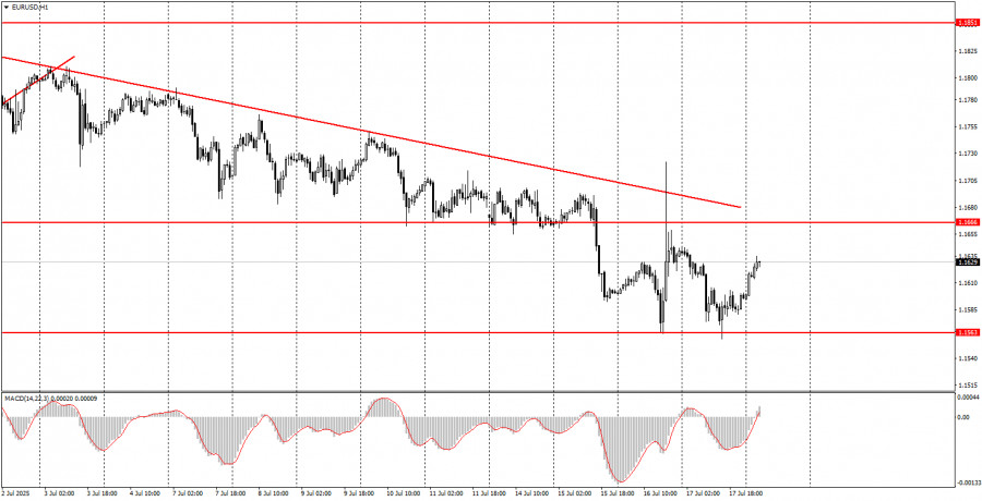 সামষ্টিক অর্থনৈতিক প্রতিবেদনের বিশ্লেষণ: সোমবার কোনো সামষ্টিক অর্থনৈতিক প্রতিবেদনের প্রকাশনা নির্ধারিত নেই। ফলে, মার্কেটে দুর্বল মুভমেন্ট দেখা যেতে পারে। অবশ্যই, ডোনাল্ড ট্রাম্প যেকোনো মুহূর্তে শুল্ক সংক্রান্ত নতুন কোনো সিদ্ধান্ত কিংবা "জেরোম পাওয়েলকে আবারও বরখাস্ত" করার ঘোষণার মাধ্যমে হঠাৎ করে মার্কেটে ঝড় সৃষ্টি করতে পারেন। তবে, এ ধরনের ঘটনাগুলো পূর্বানুমান করা সম্ভব নয়। উভয় কারেন্সি পেয়ারের মূল্যের এখনো নিম্নমুখী প্রবণতা দেখা যাচ্ছে। ফান্ডামেন্টাল ইভেন্টের বিশ্লেষণ: মৌলিক দিক থেকেও সোমবার কোনো উল্লেখযোগ্য ইভেন্ট নেই, কারণ ফেডারেল রিজার্ভ, ইউরোপীয় কেন্দ্রীয় ব্যাংক বা ব্যাংক অব ইংল্যান্ডের কোনো প্রতিনিধির গুরুত্বপূর্ণ বক্তব্য নির্ধারিত নেই। তবে, আমরা বারবার উল্লেখ করেছি যে, বর্তমানে তাদের মন্তব্যের প্রভাব খুব একটা গুরুত্বপূর্ণ নয়। এই তিনটি কেন্দ্রীয় ব্যাংকই সুস্পষ্ট আর্থিক নীতিমালা অনুসরণ করছে এবং এ বিষয়ে তাদের অবস্থান পুরোপুরি পরিষ্কার। এখনো বাণিজ্যযুদ্ধই ট্রেডারদের মূল উদ্বেগের বিষয় রয়ে গেছে এবং এর কোনো সমাধানের ইঙ্গিত এখনো পাওয়া যাচ্ছে না। পরিস্থিতি বেশ জটিল, কারণ ট্রাম্প চার মাসের বেশি সময় ধরে আলোচনার পর মাত্র তিনটি বাণিজ্য চুক্তি সম্পন্ন করতে পেরেছেন, যার মধ্যে একটি চুক্তির শর্তাবলী নিয়ে যথেষ্ট প্রশ্ন রয়েছে। সম্ভাব্য ৭৫টি চুক্তির মধ্যে মাত্র তিনটি চুক্তি সম্পন্ন হয়েছে। গত দুই সপ্তাহে, মার্কিন প্রেসিডেন্ট এমন দেশগুলোর বিরুদ্ধে পুনরায় শুল্ক বৃদ্ধির সিদ্ধান্ত নিয়েছেন, যারা ওয়াশিংটনের সঙ্গে আলোচনায় অনাগ্রহী, একই সঙ্গে তিনি তামা, ফার্মাসিউটিক্যাল এবং সেমিকন্ডাক্টরের ওপর আমদানি শুল্কও বাড়িয়েছেন। এই নেতিবাচক পরিস্থিতির মধ্যেও, গত তিন সপ্তাহে মার্কিন ডলারের মূল্য উল্লেখযোগ্যভাবে বৃদ্ধি পেয়েছে—যা মৌলিক প্রেক্ষাপটের সম্পূর্ণ বিপরীত। আমরা এখন হায়ার টাইমফ্রেমে উভয় কারেন্সি পেয়ারের মূল্যের একটি নতুন ঊর্ধ্বমুখী প্রবণতার প্রস্তুতি নিচ্ছি। উপসংহার: সপ্তাহের প্রথম দিনের ট্রেডিংয়ে, কোনো উল্লেখযোগ্য ইভেন্ট না থাকায়, উভয় কারেন্সি পেয়ারের মূল্যের খুব ধীরগতির মুভমেন্ট দেখা যেতে পারে। টেকনিক্যাল কারেকশন চলছে, তবে যেকোনো মুহূর্তে এটি শেষ হতে পারে। উভয় পেয়ারের চার্টে ডিসেন্ডিং ট্রেন্ডলাইন গঠিত হয়েছে এবং সেগুলো ব্রেকআউট করে মূল্য ঊর্ধ্বমুখী হলে ছয় মাসব্যাপী চলমান ঊর্ধ্বমুখী প্রবণতা পুনরায় শুরু হওয়ার ইঙ্গিত পাওয়া যাবে। ইউরোর মূল্য ইতোমধ্যে 1.1563 লেভেল থেকে দুইবার রিবাউন্ড করেছে, যা বিয়ারিশ প্রবণতা শেষ হওয়ার একটি প্রাথমিক সতর্ক সংকেত হিসেবে বিবেচনা করা যেতে পারে।