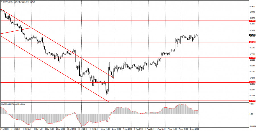 ফান্ডামেন্টাল ইভেন্টের বিশ্লেষণ: শুক্রবারের ফান্ডামেন্টাল ইভেন্টের মধ্যে আলাস্কায় রুশ ও মার্কিন নেতাদের মধ্যে অনুষ্ঠেয় বৈঠকটি উল্লেখযোগ্য। আলোচনা গভীর রাতে শুরু হবে, এবং কখন শেষ হবে তা কেউ জানে না। তাই সম্ভবত এই বৈঠক সংক্রান্ত যেকোনো তথ্য পাওয়ার আগেই ফরেক্স মার্কেট বন্ধ হয়ে যাবে। তবুও, এই ইভেন্টতির কথা মাথায় রাখা উচিত, কারণ এটি মার্কেটে তীব্রমাত্রার অস্থিরতা সৃষ্টি করতে পারে। ট্রেডারদের কাছে মূল আলোচ্য বিষয় হিসেবে বাণিজ্যযুদ্ধই রয়ে গেছে, যা গত সপ্তাহে নতুন গতি পেয়েছে। আমরা এখনও মনে করি, যেকোনো বাণিজ্য চুক্তি যাতে শুল্ক বহাল থাকে, তা মূলত "অন্য রূপে" একই বাণিজ্যযুদ্ধ। ইউরোপীয় ইউনিয়ন বা জাপানের সাথে হওয়া চুক্তির মতো সমঝোতা অবশ্যই যুক্তরাষ্ট্রের জন্য লাভজনক। তাই প্রতিটি নতুন এ ধরনের চুক্তি মার্কিন ডলারের দর বৃদ্ধিকে উসকে দিতে পারে। তবে, বৈশ্বিক এবং মৌলিক দৃষ্টিকোণ থেকে, বিনিয়োগকারীরা নতুন বাণিজ্য কাঠামো এবং ডোনাল্ড ট্রাম্পের সুরক্ষাবাদী নীতির বিষয়টি মাথায় রাখবে। এমন মৌলিক পরিস্থিতিতে, ডলারের মূল্যের শক্তিশালী বৃদ্ধির সম্ভাবনা কম।