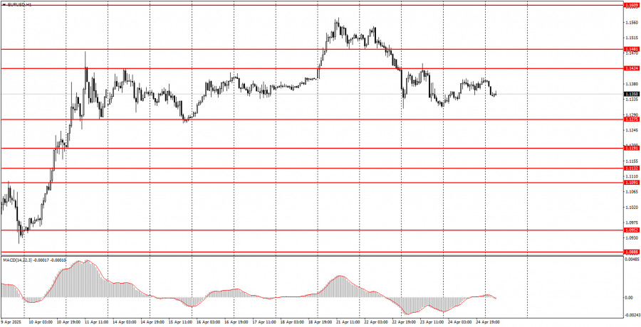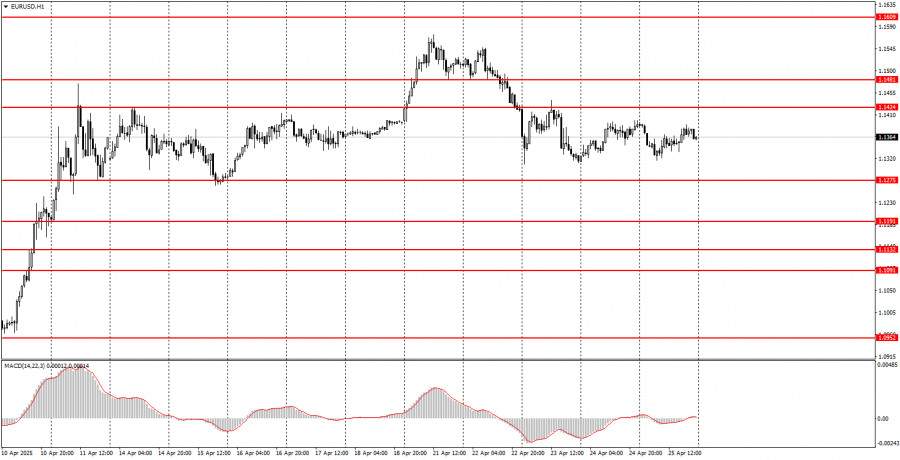 ফান্ডামেন্টাল ইভেন্টের বিশ্লেষণ: ট্রাম্পের বাণিজ্য যুদ্ধ ছাড়া অন্য কোনো ফান্ডামেন্টাল ইভেন্ট নিয়ে আলোচনা করার কোনো মানে নেই। ট্রাম্প যদি নতুন করে শুল্ক আরোপ করতে থাকেন বা বিদ্যমান শুল্ক বাড়িয়ে দেন, তাহলে অনির্দিষ্টকাল ধরে ডলারের দরপতন চলমান থাকতে পারে। বাণিজ্য যুদ্ধের উত্তেজনা বৃদ্ধি পেলে সেটি ডলারের আরও দরপতনের কারণ হতে পারে, অন্যদিকে উত্তেজনা প্রশমনের যেকোনো সংকেত ডলারের শক্তিশালীকরণে সহায়তা দিতে পারে। এই সপ্তাহে ট্রাম্প চীনের প্রতি তার অবস্থান কিছুটা নমনীয় করেছেন, তবে এটিকে এখনো উত্তেজনা প্রশমন হিসেবে বিবেচনা করা যায় না। মার্কিন প্রেসিডেন্টকে জানা মতে, আমরা অবাক হব না যদি চীনের উপর শুল্ক ছাড়ের ঘোষণা দেওয়ার পর তিনি আবার তা বাড়িয়ে দেন। ট্রাম্প জানিয়েছেন যে তিনি চীনের ওপর বাণিজ্য শুল্ক 145% স্তরে রাখার পরিকল্পনা করছেন না, যা সব মার্কেটে স্বস্তির ঢেউ সৃষ্টি করেছে। তবে একই সময়ে, চীন জানিয়েছে যে ট্রাম্পের সাথে কোনো আলোচনা বর্তমানে চলছে না। ইউরোপীয় ইউনিয়ন জানিয়েছে যে আলোচনা চলছে, তবে ইউরোপীয় কমিশন এখনো মার্কিন প্রেসিডেন্টের দাবিগুলো বুঝতে পারছে না। সুতরাং, আমরা নিশ্চিতভাবে বলতে পারি যে যুক্তরাষ্ট্রের দুই প্রধান অংশীদারের সাথে আলোচনা হয়তো হচ্ছে না, অথবা আলোচনা এখনও প্রাথমিক পর্যায়ে রয়েছে। উপসংহার: সপ্তাহের শেষ দিনের ট্রেডিংয়ে, উভয় কারেন্সি পেয়ারের মূল্য যেকোনো দিকে মুভমেন্ট প্রদর্শন করতে পারে। ডলারের জন্য ইতিবাচক খবর ইতোমধ্যে মার্কেটে বিবেচিত হয়েছে, তাই এখন উভয় পেয়ারের নতুন করে বড় ধরনের দরপতনের আশা করা কঠিন। ইউরোর মূল্যের 1.1275 লেভেল পর্যন্ত নামার সম্ভাবনা রয়েছে, তবে আরও দরপতনের সম্ভাবনা এখন সন্দেহজনক। ব্রিটিশ পাউন্ডও ইউরোর পথ অনুসরণ করতে পারে, তবে ট্রাম্প যেকোনো মুহূর্তে নতুন করে মার্কেটে ডলার বিক্রির প্রবণতা সৃষ্টি করতে পারেন।