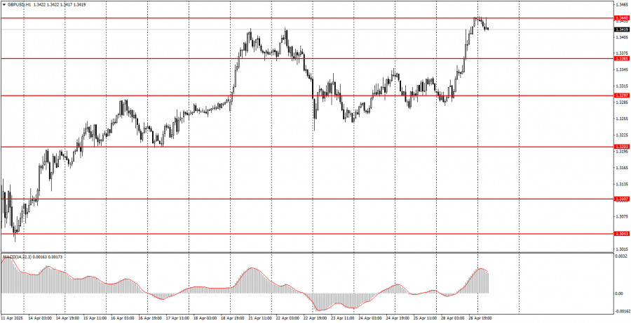 ফান্ডামেন্টাল ইভেন্টের বিশ্লেষণ: ট্রাম্পের বাণিজ্য যুদ্ধ ছাড়া অন্য কোনো ফান্ডামেন্টাল ইভেন্ট নিয়ে আলোচনা করার কোনো অর্থ নেই। ট্রাম্প নতুন নতুন শুল্ক আরোপ এবং বিদ্যমান শুল্ক বাড়িয়ে চললে অনির্দিষ্টকাল পর্যন্ত ডলারের দরপতন চলতে পারে। যেকোনো উত্তেজনার বৃদ্ধি ডলারের আরেক দফা দরপতনের দিকে নিয়ে যেতে পারে, আর উত্তেজনা প্রশমিত হলে ডলার শক্তিশালী হতে পারে। মার্কিন প্রেসিডেন্ট চীনের প্রতি তার অবস্থান কিছুটা নমনীয় করা শুরু করেছেন, তবে এখনো উত্তেজনা প্রশমনের কোনো প্রতিফলন ঘটেনি। ট্রাম্প সম্পর্কে যতটুকু জানা যায়, এটা অবাক করার মতো হবে না যদি তিনি চীনের জন্য শুল্ক কমানোর ঘোষণা দেওয়ার পর আবার তা বাড়িয়ে দেন। ডোনাল্ড ট্রাম্প বলেছেন যে, তিনি চীনা পণ্যের ওপর 145% শুল্ক বজায় রাখার কোনো ইচ্ছা পোষণ করছেন না, যা মার্কেটে কিছুটা স্বস্তির সঞ্চার ঘটিয়েছে। তবে, মার্কিন ডলারের ক্ষেত্রে কোনো আশাবাদের ঢেউ দেখা যায়নি। মার্কেটের ট্রেডাররা এখনো উত্তেজনা প্রশমনের কোনো দৃশ্যমান ইঙ্গিত দেখতে পাচ্ছে না, তাই তারা মার্কিন মুদ্রা কেনার জন্য তাড়াহুড়ো করছে না। এমনকি সোমবারেও, যখন কোনো সংবাদ ছিল না এবং ট্রেডাররা সক্রিয় ছিল, তখনও মার্কেটের ট্রেডাররা ডলার বিক্রির পথই অনুসরণ করেছে। উপসংহার: নতুন সপ্তাহের দ্বিতীয় দিনের ট্রেডিংয়ে, উভয় কারেন্সি পেয়ারের মূল্য যেকোনো দিকে মুভমেন্ট প্রদর্শন করতে পারে, তবে আমরা সম্ভবত ফ্ল্যাট ট্রেডিং দেখতে পাব — অন্তত ইউরোর ক্ষেত্রে। পাউন্ড স্টার্লিংয়ের মূল্য এখনো অনেক বেশি ঊর্ধ্বমুখী প্রবণতা প্রদর্শন করছে, এবং এর জন্য কোনো সংবাদের প্রয়োজন হচ্ছে না। ট্রেডিং সিস্টেমের মূল নিয়মাবলী: