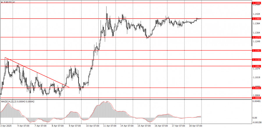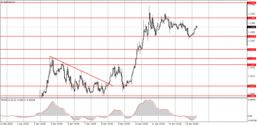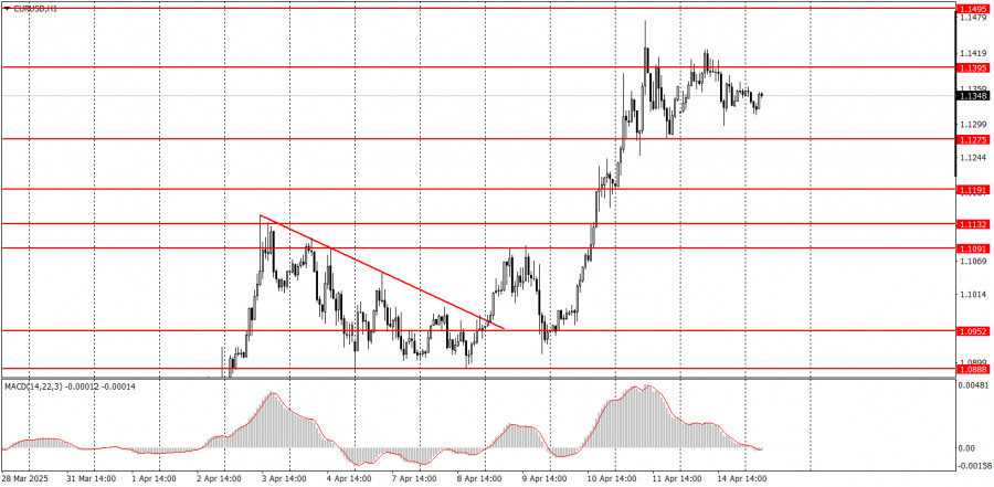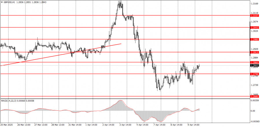 ফান্ডামেন্টাল ইভেন্টের বিশ্লেষণ: এখনো ট্রাম্পের বাণিজ্যযুদ্ধ ছাড়া অন্য কিছু নিয়ে আলোচনা করার তেমন কোনো অর্থ নেই। গত সপ্তাহের ঊর্ধ্বমুখী কারেকশনের পরও ডলারের দরপতন অনির্দিষ্টকাল ধরে চলতে পারে। আমরা ট্রেডারদের পরামর্শ দেব যে তারা যেন কেবলমাত্র বৃহত্তম দেশ ও জোটগুলোর শীর্ষ কর্মকর্তাদের শুল্ক সংক্রান্ত বিবৃতির দিকেই মনোযোগ দেন। ট্রাম্প ইতোমধ্যে জানিয়েছেন, "অন্যায় দূর করার" লক্ষ্যে নেওয়া তার পদক্ষেপের বিরুদ্ধে কেউ প্রতিক্রিয়া জানালে, তার জবাবে নতুন নিষেধাজ্ঞা ও শুল্ক আরোপ করা হবে। একই সময়ে, যুক্তরাষ্ট্রের প্রেসিডেন্ট চীন ব্যতীত সকল দেশের জন্য ৯০ দিনের জন্য শুল্ক ছাড়ের ঘোষণা দিয়েছেন, যার মধ্যে আমদানিকৃত সকল পণ্যের ওপর 10% হারে নির্ধারিত শুল্ক প্রযোজ্য হবে। ট্রাম্পের মতে, এই সময়টি বাণিজ্য চুক্তি নিয়ে আলোচনা করার জন্য নির্ধারিত। তবে আমরা মনে করিয়ে দিতে চাই যে, ইউরোপীয় ইউনিয়ন বা চীনের সঙ্গে চুক্তি হওয়ার সম্ভাবনা এখনও অত্যন্ত কম। উপসংহার: এ সপ্তাহের চতুর্থ দিনের ট্রেডিংয়ে EUR/USD এবং GBP/USD—উভয় কারেন্সি পেয়ারের মূল্য যেকোনো দিকেই মুভমেন্ট প্রদর্শন করতে পারে। মার্কেটে এখনো আতঙ্ক ও বিশৃঙ্খলা বিরাজ করছে, ফলে মূল্যের মুভমেন্টে কোনো স্পষ্ট যৌক্তিকতা দেখা যাচ্ছে না। কয়েক ঘণ্টা পরপরই বাণিজ্যযুদ্ধ সম্পর্কিত সংবাদ প্রকাশিত হচ্ছে, এবং আজ প্রকাশিতব্য যুক্তরাষ্ট্রের মুদ্রাস্ফীতি প্রতিবেদনও মার্কেটের মুভমেন্টের উপর প্রভাব ফেলতে পারে।