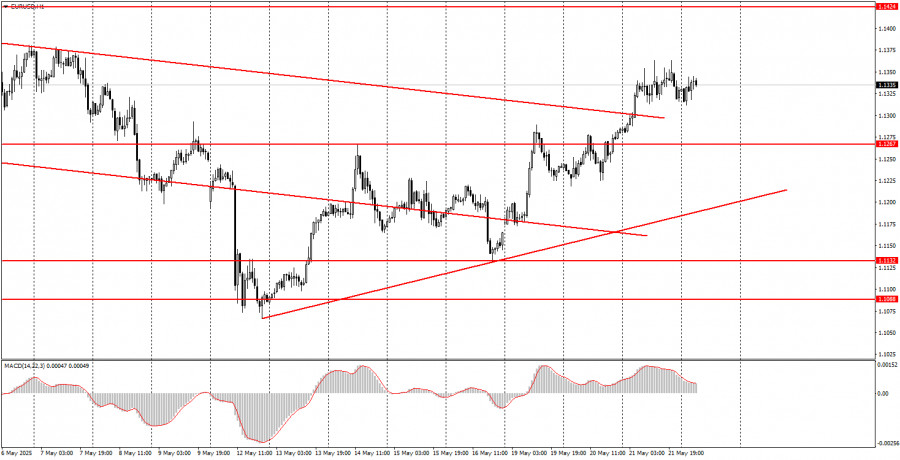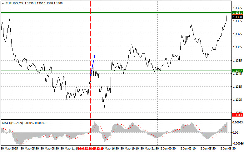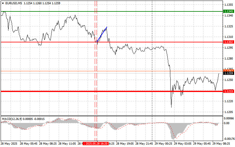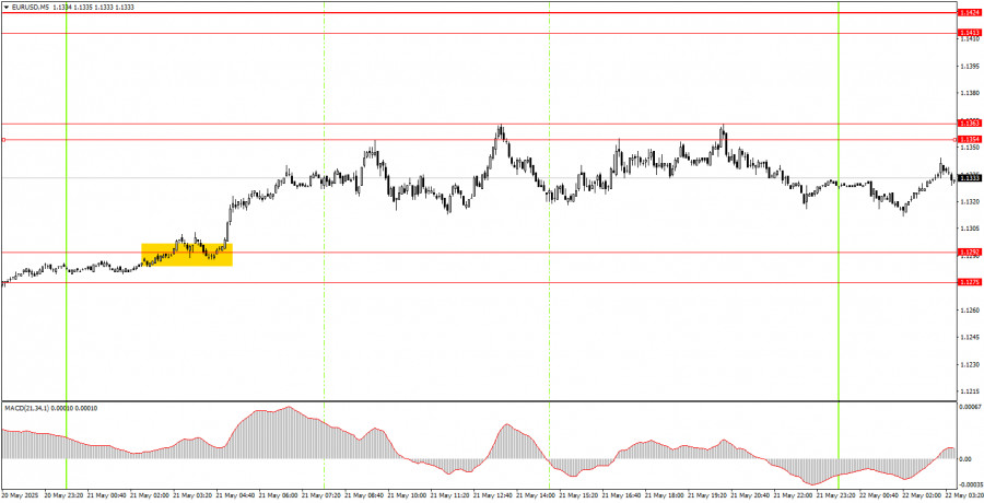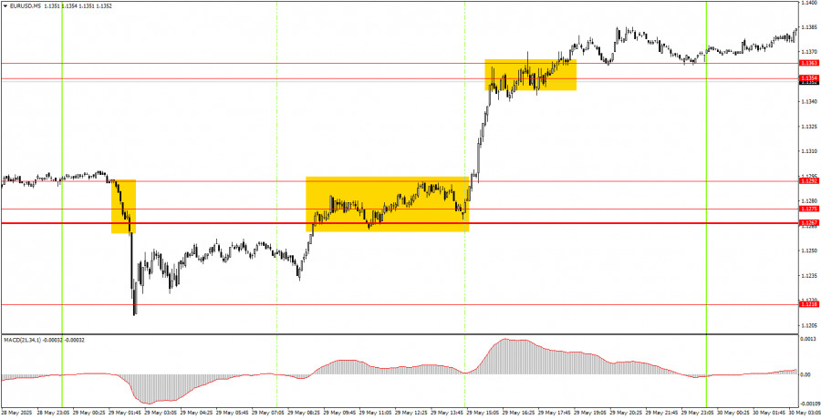 EUR/USD পেয়ারের 5M চার্ট বৃহস্পতিবার ৫ মিনিটের টাইমফ্রেমে দুটি অত্যন্ত কার্যকর ট্রেডিং সিগন্যাল গঠিত হয়েছিল। ইউরোপীয় সেশনের পুরো সময় জুড়ে, এই পেয়ারের মূল্য 1.1267–1.1292 এর এরিয়া ব্রেক করার চেষ্টা করছিল, এবং মার্কিন সেশনের শুরুতে অবশেষে তা করতে সফল হয়। এরপরে একটি শক্তিশালী ঊর্ধ্বমুখী প্রবণতা দেখা যায়, যা মূল্য 1.1354–1.1363 এর উপরে পৌঁছানোর পর থামে। এই লেভেলের কাছে লং পজিশন ক্লোজ করা যেত। এই ট্রেড থেকে কমপক্ষে ৬০–৭০ পিপস লাভ করা সম্ভব হয়েছিল।