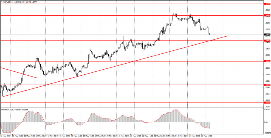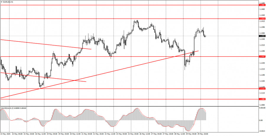 বৃহস্পতিবারের ট্রেডের বিশ্লেষণ EUR/USD পেয়ারের 1H চার্ট বৃহস্পতিবার দিনের শুরুতে EUR/USD কারেন্সি পেয়ার তীব্র দরপতনের শিকার হয়, তবে দিনের বাকি সময়টিতে শক্তিশালী ঊর্ধ্বমুখী প্রবণতার সাথে ট্রেড করা হয়েছে। বৃহস্পতিবার এই পেয়ারের মূল্যের যে মুভমেন্ট দেখা গেছে তা ব্যাখ্যা করা কিছুটা কঠিন, তবে আমরা সেটা করার চেষ্টা করব। রাতের বেলায় (যখন হঠাৎ করে ডলারের মূল্য বৃদ্ধি পায়), জানা যায় যে, যুক্তরাষ্ট্রের আন্তর্জাতিক বাণিজ্য আদালত ডোনাল্ড ট্রাম্প কর্তৃক আরোপিত অধিকাংশ শুল্ক বাতিল করার রায় দিয়েছে। ম্যানহাটনের আদালত রায় দেয় যে মার্কিন প্রেসিডেন্টের এমন পদক্ষেপ নেওয়ার কোনো অধিকার বা ক্ষমতা নেই — কেবলমাত্র কংগ্রেসই বৈশ্বিক বাণিজ্যিক শুল্ক আরোপ করতে পারে। এই খবর ডলারের মূল্যের ঊর্ধ্বমুখী মুভমেন্ট সৃষ্টি করে। তবে পরে হঠাৎ কেন আবার ডলারের দরপতন শুরু হল? কারণ ট্রাম্প সঙ্গে সঙ্গে আদালতের ওপর চাপ সৃষ্টি করা শুরু করেন, আপিল করার ঘোষণা দেন এবং মামলাটি সুপ্রিম কোর্টে নিয়ে যাওয়ার হুমকি দেন। সন্ধ্যার দিকে ম্যানহাটনের আদালত তার রায় ১৪ দিনের জন্য স্থগিত করে। এইভাবে, ট্রাম্প পুরো বিষয়টি খুব সহজে সামাল দিয়ে ফেলেন। বাণিজ্যযুদ্ধ চলমান রয়েছে, শুল্ক বহাল রয়েছে, এবং ডলার আবারও দরপতনের শিকার হচ্ছে