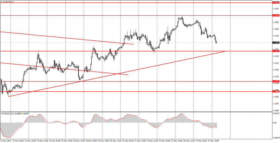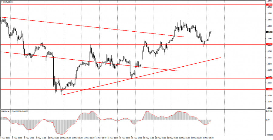 বুধবারের ট্রেডের বিশ্লেষণ EUR/USD পেয়ারের 1H চার্ট বুধবার ধীর-স্থিরভাবে EUR/USD কারেন্সি পেয়ারের মূল্যের ঊর্ধ্বমুখী মুভমেন্ট অব্যাহত ছিল। মূল্য 1.1267 এর লেভেল ব্রেক করেছে, যা এর আগে বহুবার ব্রেক করতে ব্যর্থ হয়েছিল, এবং একটি নতুন অ্যাসেন্ডিং ট্রেন্ডলাইন গঠিত হয়েছে। ফলে এখন সবকিছুই ডোনাল্ড ট্রাম্পের প্রত্যাবর্তনের পর শুরু হওয়া ৪ মাসব্যাপী ঊর্ধ্বমুখী প্রবণতা পুনরারম্ভের মতো মনে হচ্ছে। এবারও মার্কেটের ট্রেডারদের কাছে ডলার বিক্রির জন্য কোনো শক্তিশালী কারণ ছিল না, কারণ ট্রাম্প নতুন কোনো শুল্ক আরোপ করেননি কিংবা এমন কোনো সিদ্ধান্ত নেননি যা মার্কিন অর্থনীতি বা বৈশ্বিক স্থিতিশীলতার জন্য হুমকি তৈরি করতে পারে। বরং, হোয়াইট হাউস চলমান বাণিজ্য আলোচনা ও শুল্ক হ্রাসের মাধ্যমে গত এক মাসে বাণিজ্য সংঘাত প্রশমনের ইঙ্গিত দিয়েছে। তবুও, আমরা দেখতে পাচ্ছি, এই সংবাদও মার্কিন ডলারের বিক্রি থামাতে পারেনি। মার্কেটের ট্রেডাররা কার্যত এখনো ডলার, ট্রাম্প এবং সামগ্রিক মার্কিন শুল্ক নীতির প্রতি নেতিবাচক মনোভাব প্রকাশ করছে।