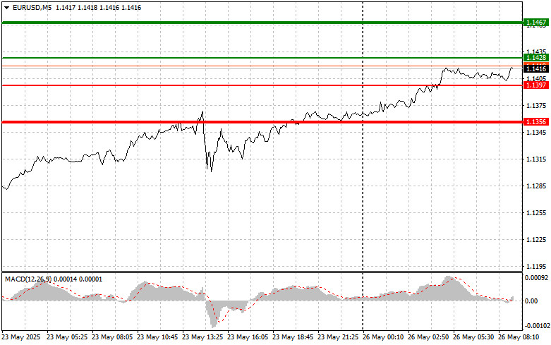 ইউরোর ট্রেডের বিশ্লেষণ এবং টিপস দিনের দ্বিতীয়ার্ধে যখন MACD সূচকটি শূন্যের বেশ নিচে নেমে গিয়েছিল, তখন এই পেয়ারের মূল্য প্রথমবারের মতো 1.1302 এর লেভেল টেস্ট করে — যার ফলে এই পেয়ারের মূল্যের নিম্নমুখী হওয়ার সম্ভাবনা সীমিত হয়ে পড়ে। এই কারণেই আমি ইউরো বিক্রি করিনি। দ্বিতীয়বার 1.1302 লেভেল টেস্ট করার সময় MACD সূচকটি ওভারসোল্ড জোনে ছিল, যার ফলে এই পেয়ার ক্রয়ের জন্য পরিকল্পনা #2 কার্যকর করার সুযোগ পাওয়া যায় এবং এই পেয়ারের মূল্য ২০ পিপস বৃদ্ধি পায়। মার্কিন ফেডারেল ট্রেড কোর্ট ট্রাম্প কর্তৃক আরোপিত বৈশ্বিক শুল্ক বাতিল করে এবং মার্কিন প্রশাসনকে এসব শুল্ক আর প্রয়োগ না করার নির্দেশ দিলে ইউরোর মূল্য দ্রুত হ্রাস পায় এবং ডলার শক্তিশালী হয়ে ওঠে। বিনিয়োগকারীরা এই সিদ্ধান্তকে বাণিজ্যিক উত্তেজনা প্রশমনের লক্ষণ এবং আরও পূর্বানুমেয় অর্থনৈতিক কৌশলে ফিরে যাওয়ার ইঙ্গিত হিসেবে দেখেছে। এই আদালতের রায় দীর্ঘ আইনি প্রক্রিয়ার পর এসেছে। আশা করা হচ্ছে, শুল্ক প্রত্যাহারের পদক্ষেপ আমদানিকৃত পণ্যের খরচ কমাবে এবং রপ্তানির সুযোগ বাড়াবে। তবে, শুল্ক প্রত্যাহার মার্কিন শিল্প খাতের উপর নেতিবাচক প্রভাব ফেলতে পারে, বিশেষত যেসব খাত আগে বিদেশি প্রতিযোগিতা থেকে সুরক্ষিত ছিল। একই সময়ে, ডলার শক্তিশালী হলে তা মার্কিন রপ্তানি পণ্যকে বিদেশি ভোক্তাদের কাছে সাশ্রয়ী মূল্যের দিক থেকে প্রতিযোগিতার মুখে গেলতে পারে — যা রপ্তানি খাতের ওপর চাপ তৈরি করতে পারে। আজ সকালের ইউরোজোনে উল্লেখযোগ্য কোনো অর্থনৈতিক প্রতিবেদন প্রকাশের সম্ভাবনা না থাকায় EUR/USD পেয়ারের মূল্যের কিছুটা রিবাউন্ডের সুযোগ রয়েছে। এই সময়কালে গুরুত্বপূর্ণ সামষ্টিক অর্থনৈতিক প্রতিবেদন প্রকাশের কথা না থাকায় ট্রেডাররা কিছুটা স্বস্তি পেতে পারেন। অর্থনৈতিক প্রতিবেদন প্রকাশের কথা না থাকায় মার্কেটের ট্রেডাররা হয়তো আবার শুল্ক পরিস্থিতির দিকেই মনোযোগ দেবে। এই বিষয়ে ট্রাম্পের যেকোনো মন্তব্য অস্থিরতার মাত্রা বাড়াতে পারে এবং ইউরোর ওপর বাড়তি চাপ সৃষ্টি করতে পারে। দৈনিক কৌশলের ক্ষেত্রে, আমি মূলত পরিকল্পনা #1 এবং #2 বাস্তবায়নের ওপর মনোযোগ দেব।