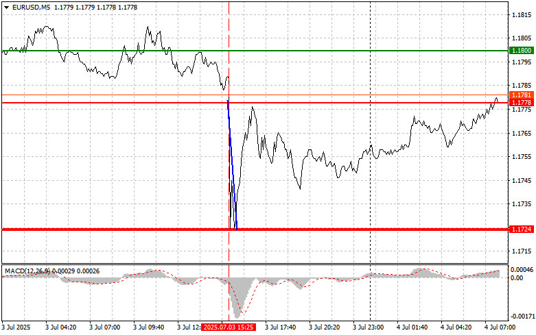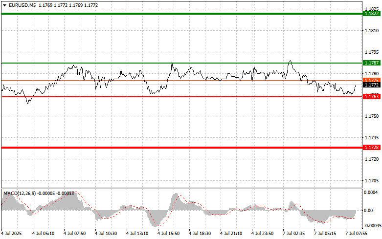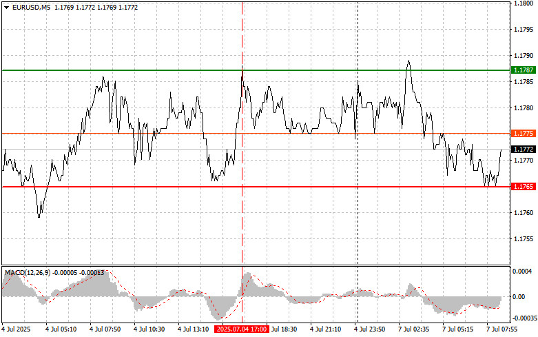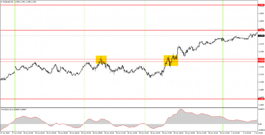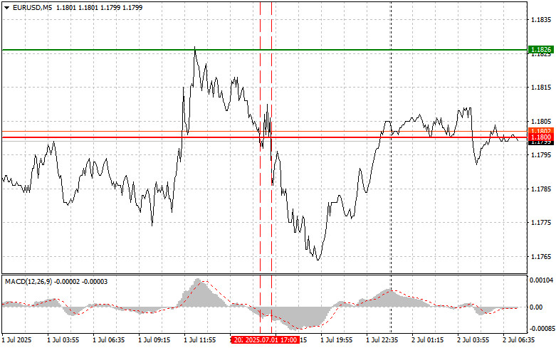 EUR/USD পেয়ারের 5M চার্ট ৫ মিনিটের টাইমফ্রেমে, সোমবার দুটি ট্রেডিং সিগন্যাল গঠিত হয়। ইউরোপীয় সেশনের সময়, মূল্য 1.1740–1.1745 এরিয়ায় বাউন্স করেছিল, তবে মার্কেট ফ্ল্যাট অবস্থার মধ্যে থাকায় এই পেয়ারের মূল্য মাত্র ২০ পিপস হ্রাস পেয়েছিল। দিনের দ্বিতীয়ার্ধে, এই পেয়ারের মূল্য 1.1740–1.1745 এরিয়া ব্রেক করে উপরের দিকে উঠে যায়, যা নতুন ট্রেডারদের লং পজিশন ওপেন করার সুযোগ তৈরি করে। আজ সকালে, এই পেয়ারের মূল্য 1.1802 এর নিকটবর্তী লক্ষ্যমাত্রায় পৌঁছেছে।