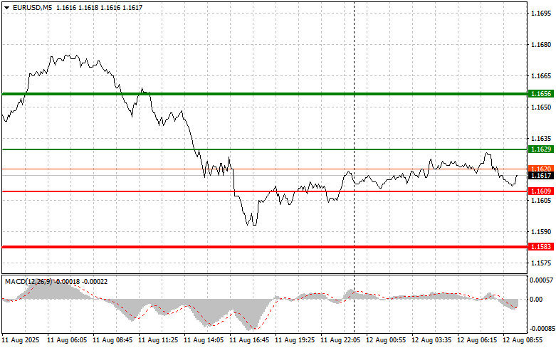 বাই সিগন্যাল পরিকল্পনা 1: আজ যখন ইউরোর মূল্য 1.1656-এর লেভেলে বৃদ্ধির লক্ষ্যে 1.1629-এর (চার্টে সবুজ লাইন দ্বারা চিহ্নিত) লেভেলে পৌঁছাবে, তখন আপনি ইউরো কিনতে পারেন। মূল্য 1.1656-এর লেভেলে গেলে, আমি লং পজিশন ক্লোজ করার পরিকল্পনা করছি এবং এন্ট্রি পয়েন্ট থেকে বিপরীত দিকে 30-35 পিপসের মুভমেন্টের উপর নির্ভর করে ইউরোর শর্ট পজিশন ওপেন করব। আজ চলমান ঊর্ধ্বমুখী প্রবণতার সাথে সঙ্গতি রেখে ইউরোর মূল্য বৃদ্ধি পেতে পারে। গুরুত্বপূর্ণ! এই পেয়ার কেনার আগে, নিশ্চিত করুন যে MACD সূচকটি শূন্যের উপরে রয়েছে এবং সেখান থেকে উপরের দিকে উঠতে শুরু করেছে। পরিকল্পনা 2: আজ MACD সূচকটি ওভারসোল্ড জোনে থাকাকালীন সময়ে 1.1609-এর লেভেলে মূল্যের পরপর দুটি টেস্টের ক্ষেত্রে আমি ইউরো কেনার পরিকল্পনা করছি। এটি এই পেয়ারের মূল্যের নিম্নমুখী হওয়ার সম্ভাবনাকে সীমিত করবে এবং বাজারদরকে বিপরীতমুখী করে ঊর্ধ্বমুখী করবে। আমরা 1.1629 এবং 1.1656-এর বিপরীতমুখী লেভেলের দিকে এই পেয়ারের দর বৃদ্ধির প্রত্যাশা করতে পারি।