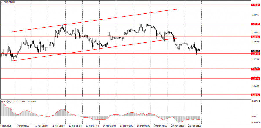 বৃহস্পতিবারের ট্রেডের বিশ্লেষণ EUR/USD পেয়ারের 1H চার্ট বৃহস্পতিবার ফেডারেল রিজার্ভের বৈঠকের ফলাফল ঘোষণার পর EUR/USD কারেন্সি পেয়ার দরপতনের সম্মুখীন হয়। অবশেষে, আমরা মার্কিন ডলারকে কিছুটা শক্তিশালী হতে দেখতে পেলাম এবং শেষ পর্যন্ত মার্কেটের ট্রেডাররা কিছুটা যুক্তিসঙ্গত প্রতিক্রিয়া দেখিয়েছে। মনে করিয়ে দিতে চাই যে, FOMC-এর বৈঠকটির ফলাফলকে হকিশ বা কঠোর হিসেবে বিবেচনা করা যেতে পারে। গত কয়েক সপ্তাহ ধরে, মার্কেটে আতঙ্ক বিরাজ করছিল—সবকিছু একসাথে শুরু হয়েছিল: যুক্তরাষ্ট্রে অর্থনৈতিক মন্দা, ফেডের আগ্রাসীভাবে সুদের হার হ্রাস, উচ্চ মুদ্রাস্ফীতি এবং আরও অনেক কিছু। তবে, জেরোম পাওয়েল এবং FOMC স্পষ্টভাবে জানিয়ে দিয়েছে যে উদ্বেগের কিছু নেই: যুক্তরাষ্ট্রের অর্থনীতি স্থিতিশীল অবস্থায় রয়েছে, শ্রমবাজারও শক্তিশালী রয়েছে, ফেড ২০২৫ সালে মাত্র দুইবার সুদের হার হ্রাসের প্রত্যাশা করছে, এবং মুদ্রাস্ফীতি হ্রাসই তাদের প্রধান অগ্রাধিকার হবে। হ্যাঁ, জিডিপির পূর্বাভাস কমানো হয়েছে, তবে মুদ্রাস্ফীতির পূর্বাভাস বাড়ানো হয়েছে—এবং উচ্চতর মুদ্রাস্ফীতি এই ইঙ্গিত দেয় যে সুদের হার দীর্ঘ সময় ধরে উচ্চ থাকবে অথবা ধীরগতিতে হ্রাস পাবে।