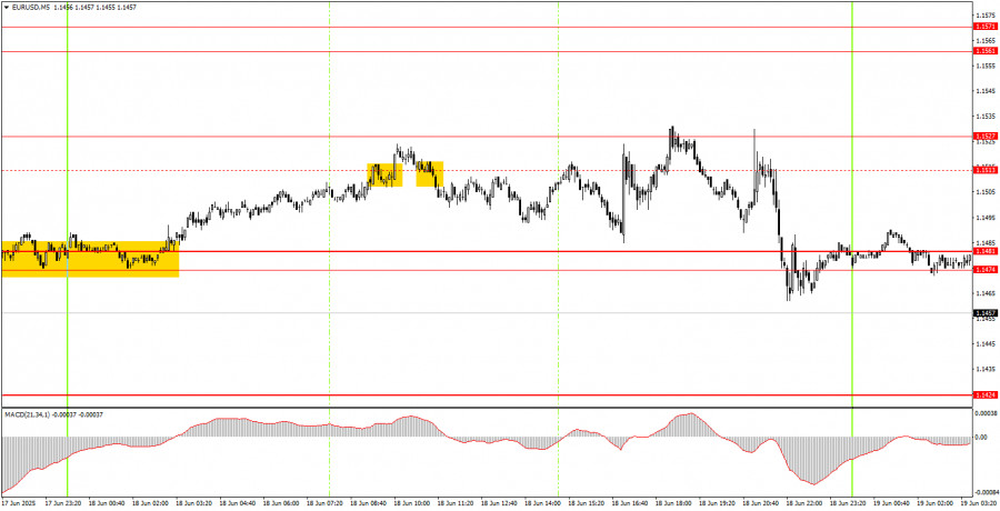 EUR/USD পেয়ারের 5M চার্ট ৫-মিনিটের টাইমফ্রেমে, বুধবার অত্যন্ত এলোমেলো মুভমেন্ট পরিলক্ষিত হয়েছে। শুরুতেই, ফেডের বৈঠকের ফলাফল ঘোষণার আগে, এই পেয়ারের মূল্য সম্পূর্ণরূপে ফ্ল্যাট রেঞ্জে আটকে ছিল। ফলে, যেসব সিগন্যাল তৈরি হয়েছিল, তার বেশিরভাগই ভুল ছিল। 1.1513 লেভেলের আশেপাশে গঠিত প্রথম দুটি সিগন্যাল ভুল ছিল, তাই পরবর্তী সব সিগন্যাল উপেক্ষা করা উচিত ছিল। দিনের শেষে এই লেভেল সংশোধন করে 1.1527 করা হয়েছে। বৃহস্পতিবারের ট্রেডিংয়ের কৌশল: ঘণ্টাভিত্তিক টাইমফ্রেমে, EUR/USD পেয়ারের মূল্যের ঊর্ধ্বমুখী প্রবণতা অব্যাহত রয়েছে, যা ডোনাল্ড ট্রাম্প মার্কিন প্রেসিডেন্ট হিসেবে দ্বায়িত্ব নেয়ার পর শুরু হয়েছিল এবং সম্ভবত পরবর্তী প্রেসিডেন্ট দায়িত্ব গ্রহণের আগ পর্যন্ত এই ঊর্ধ্বমুখী প্রবণতা অব্যাহত থাকবে। আপাতত, কেবলমাত্র ট্রাম্প মার্কিন প্রেসিডেন্ট এই বাস্তবতাই ডলারের মূল্যের নিম্নমুখী প্রবণতার বজায় রাখার জন্য যথেষ্ট। এমনকি ইরান ও ইসরায়েলের মধ্যে ক্রমবর্ধমান সামরিক সংঘাতও ডলারের সার্বিক পরিস্থিতি তেমন প্রভাব ফেলেনি। মার্কিন প্রেসিডেন্ট অব্যাহতভাবে হুমকি দিয়ে যাচ্ছেন, চূড়ান্ত শর্ত আরোপ করছেন, শুল্ক আরোপ করছেন বা বাড়াচ্ছেন এবং ইরানের সঙ্গে যুদ্ধের প্রস্তুতি নিচ্ছেন। ফলে, মার্কেটের ট্রেডাররা প্রতিদিন ডলার বিক্রি না করলেও, তারা মধ্যমেয়াদে ডলার কেনার ব্যাপারেও খুব একটা আগ্রহ দেখাচ্ছে না। বৃহস্পতিবার, হয়তো EUR/USD পেয়ারের দরপতন অব্যাহত থাকতে পারে, যদিও ফেডের গতকালের বৈঠকের ফলাফল এখনো পুরোপুরিভাবে এই পেয়ারের মূল্য নির্ধারণে প্রতিফলিত হয়নি। একটি ট্রেন্ডলাইন গঠিত হয়েছে, তবে আমরা এই সম্ভাবনা সম্পূর্ণভাবে উড়িয়ে দিচ্ছি না যে ডলার ইতোমধ্যে পূর্বের নিম্ন লেভেলে—তিন বছরের মধ্যে সর্বনিম্ন লেভেলের কাছাকাছি—ফিরে যেতে পারে, এমনকি আজই এটি ঘটতে পারে। বৃহস্পতিবার ৫-মিনিট টাইমফ্রেমে ট্রেডিংয়ের জন্য প্রাসঙ্গিক লেভেলগুলো হলো: 1.1132–1.1140, 1.1198–1.1218, 1.1267–1.1292, 1.1354–1.1363, 1.1413–1.1424, 1.1474–1.1481, 1.1527, 1.1561–1.1571, 1.1609, 1.1666, 1.1704, 1.1802। বৃহস্পতিবারের ক্যালেন্ডারে একমাত্র উল্লেখযোগ্য ইভেন্ট হলো ইউরোপীয় কেন্দ্রীয় ব্যাংকের প্রেসিডেন্ট ক্রিস্টিন লাগার্দের দুটি বক্তব্য অনুষ্ঠিত হবে। আমরা মনে করি, এই ইভেন্টগুলো মার্কেটে বড় কোনো প্রভাব ফেলবে না, এবং ট্রেডাররা সম্ভবত ফেড ও ব্যাংক অব ইংল্যান্ডের বৈঠকের ফলাফলের প্রতিক্রিয়ার দিকেই মনোযোগ ধরে রাখবে।