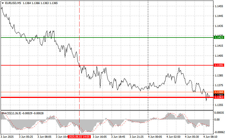 সেল সিগন্যাল পরিকল্পনা #1: EUR/USD পেয়ারের মূল্য চার্টে লাল লাইন দ্বারা চিহ্নিত 1.1355-এর লেভেলে পৌঁছানোর পর আমি ইউরো বিক্রি করার পরিকল্পনা করছি। লক্ষ্যমাত্রা হবে 1.1317-এর লেভেল, যেখানে মূল্য পৌঁছালে আমি সেল পজিশন থেকে বেরিয়ে যাওয়ার পরিকল্পনা করছি এবং এন্ট্রি পয়েন্ট থেকে বিপরীত দিকে 20-25 পিপসের মুভমেন্টের উপর নির্ভর করে ইউরোর বাই পজিশন ওপেন করব। PMI সূচকের তীব্র পতন পরিলক্ষিত হলে ইউরো বিক্রির প্রবণতা ফিরে আসতে পারে। গুরুত্বপূর্ণ! বিক্রি করার আগে, নিশ্চিত করুন যে MACD সূচকটি শূন্যের নিচে রয়েছে এবং শূন্যের নিচে নামতে শুরু করেছে। পরিকল্পনা #2: MACD সূচকটি ওভারবট জোনে থাকাকালীন সময়ে 1.1382-এর লেভেলে মূল্যের পরপর দুটি টেস্টের ক্ষেত্রেও আমি আজ ইউরো বিক্রি করতে যাচ্ছি। এটি এই পেয়ারের মূল্যের ঊর্ধ্বমুখী হওয়ার সম্ভাবনাকে সীমিত করবে এবং বাজারদরকে বিপরীতমুখী করে নিম্নমুখী করবে। আমরা 1.1355 এবং 1.1317-এর বিপরীতমুখী লেভেলের দিকে এই পেয়ারের দরপতনের আশা করতে পারি।