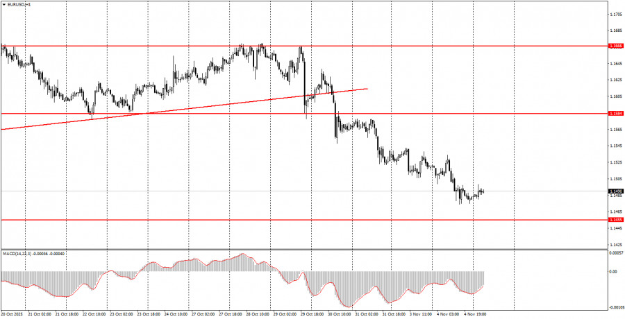 শুক্রবারের ট্রেডিংয়ের পর্যালোচনা: EUR/USD পেয়ারের 1-ঘন্টার চার্ট শুক্রবারও EUR/USD কারেন্সি পেয়ারের মূল্যের চলমান নিম্নমুখী প্রবণতা অব্যাহত ছিল, যদিও এর পেছনের কারণগুলো কিছুটা সন্দেহজনক ছিল। সপ্তাহের শেষ দিনের ট্রেডিংয়ে, নতুন ট্রেডারদের জন্য একমাত্র গুরুত্বপূর্ণ প্রতিবেদন হিসেবে ইউরোজোনের মূল্যস্ফীতির প্রতিবেদন প্রকাশিত হয়েছে। মনে করিয়ে দিই, ইউরোপীয় ইউনিয়নে মূল্যস্ফীতির প্রতিবেদন দুটি ধাপে প্রকাশিত হয়, যার মধ্যে প্রথম প্রতিবেদনটি সবচেয়ে বেশি গুরুত্বপূর্ণ। শুক্রবার, অক্টোবর মাসের প্রাথমিক (প্রথম) অনুমান প্রকাশিত হয়, যেখানে বার্ষিক ভিত্তিতে মুদ্রাস্ফীতির হার ছিল 2.1% — যা বিশ্লেষকদের পূর্বাভাসের সঙ্গেই সঙ্গতিপূর্ণ ছিল। অর্থাৎ, প্রতিক্রিয়া জানানোর মতো কোনো ফলাফল ছিল না এবং আবারও ইউরোর দরপতন শুরু হওয়ার জন্য কোনো যৌক্তিক কারণও ছিল না। পূর্বাভাস ও প্রকৃত ফলাফলের তুলনার বাইরে গিয়ে, আমরা এই বিষয়টির ওপর নজর দিতে পারি যে ইউরোপে মূল্যস্ফীতি মন্থর হচ্ছে। মূল্যস্ফীতি হ্রাস পেলে সেটি আনুষ্ঠানিকভাবে ইঙ্গিত দেয় যে ইউরোপীয় কেন্দ্রীয় ব্যাংকের (ইসিবি) "ডোভিশ" বা নমনীয় অবস্থান সম্ভবত আরও দৃঢ় হচ্ছে, এবং এর ফলে সুদের হার হ্রাসের সম্ভাবনা কিছুটা বেড়ে যায়। তবে, এই ক্ষেত্রে মূল্যস্ফীতির পতন এতটাই সামান্য যে ইসিবি কেবল তখনই পদক্ষেপ নেবে যদি মুদ্রাস্ফীতির হার 2%-এর নিচে নেমে আসে। সুতরাং, শুক্রবারের মুদ্রাস্ফীতি প্রতিবেদন ইসিবির আর্থিক নীতিমালায় তেমন কোনো প্রভাব ফেলেনি। ইউরোপীয় মুদ্রা এখন শুধুই টেকনিক্যাল প্রেক্ষাপটের ভিত্তিতে দরপতনের শিকার হচ্ছে।