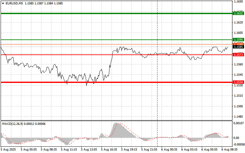 বাই সিগন্যাল পরিকল্পনা #1: আজ যখন ইউরোর মূল্য 1.1632-এর লেভেলে বৃদ্ধির লক্ষ্যে 1.1595-এর (চার্টে সবুজ লাইন দ্বারা চিহ্নিত) লেভেলে পৌঁছাবে, তখন আপনি ইউরো কিনতে পারেন। মূল্য 1.1632-এর লেভেলে গেলে, আমি লং পজিশন ক্লোজ করার পরিকল্পনা করছি এবং এন্ট্রি পয়েন্ট থেকে বিপরীত দিকে 30-35 পিপসের মুভমেন্টের উপর নির্ভর করে ইউরোর শর্ট পজিশন ওপেন করব। আজ শুধুমাত্র আসন্ন প্রতিবেদনের ইতিবাচক ফলাফল প্রকাশিত হলে ইউরোর মূল্যের ঊর্ধ্বমুখী প্রবণতা দেখা যেতে পারে। গুরুত্বপূর্ণ! এই পেয়ার কেনার আগে, নিশ্চিত করুন যে MACD সূচকটি শূন্যের উপরে রয়েছে এবং সেখান থেকে উপরের দিকে উঠতে শুরু করেছে। পরিকল্পনা #2: আজ MACD সূচকটি ওভারসোল্ড জোনে থাকাকালীন সময়ে 1.1573-এর লেভেলে মূল্যের পরপর দুটি টেস্টের ক্ষেত্রে আমি ইউরো কেনার পরিকল্পনা করছি। এটি এই পেয়ারের মূল্যের নিম্নমুখী হওয়ার সম্ভাবনাকে সীমিত করবে এবং বাজারদরকে বিপরীতমুখী করে ঊর্ধ্বমুখী করবে। আমরা 1.1595 এবং 1.1632-এর বিপরীতমুখী লেভেলের দিকে এই পেয়ারের দর বৃদ্ধির প্রত্যাশা করতে পারি।