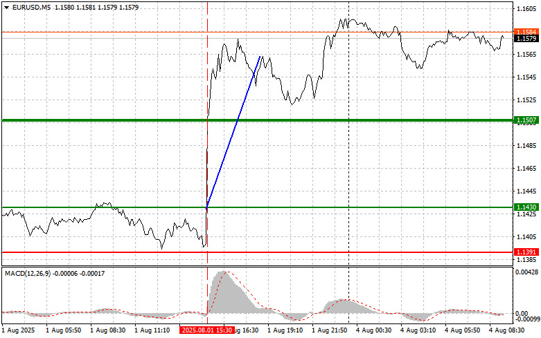 ইউরোর ট্রেডিংয়ের বিশ্লেষণ এবং টিপস যখন MACD সূচকটি শূন্যের উপরে উঠতে শুরু করেছিল তখন এই পেয়ারের মূল্য 1.1430-এর লেভেল টেস্ট করেছিল, যা ইউরো কেনার জন্য একটি সঠিক এন্ট্রি পয়েন্ট নিশ্চিত করেছিল এবং এর ফলে এই পেয়ারের মূল্য 40 পিপসেরও বেশি বৃদ্ধি পেয়েছে। জুলাইয়ের মার্কিন ননফার্ম পেরোল প্রতিবেদনের হতাশাজনক ফলাফলের প্রভাবে ডলারের তীব্র দরপতন দেখা যায়। প্রতিবেদনে দেখা গেছে, জুলাই মাসে কেবলমাত্র 73,000টি নতুন কর্মসংস্থান সৃষ্টি হয়েছে, যেখানে অর্থনীতিবিদদের মধ্যম পূর্বাভাস ছিল 104,000। তাছাড়া, আগের দুই মাসের ফলাফল প্রায় 260,000 হ্রাস করে সংশোধন করা হয়েছে, যার ফলে তিন মাসে গড় কর্মসংস্থানের বৃদ্ধি কমে দাঁড়িয়েছে মাত্র 35,000—যা 2020 সালের মহামারির পর সর্বনিম্ন স্তর। বেকারত্বের হার 4.1% থেকে বেড়ে 4.2%-এ পৌঁছেছে। আজ ইউরোজোনে Sentix থেকে বিনিয়োগকারীদের আস্থা সূচক সংক্রান্ত প্রতিবেদন প্রকাশিত হবে। এই প্রতিবেদনের ইতিবাচক ফলাফল প্রকাশিত হলে ইউরোর ক্রেতারা গত সপ্তাহের শেষে শুরু হওয়া ঊর্ধ্বমুখী প্রবণতা আরও দীর্ঘায়িত করতে পারেন। এই মোমেন্টাম ইউরোকে মার্কিন ডলারসহ অন্যান্য প্রধান মুদ্রার বিপরীতে আরও সমর্থন দিতে পারে। তবে টেকনিক্যাল বিষয়গুলো অবশ্যই বিবেচনায় নিতে হবে। ইউরোর মূল্য নির্দিষ্ট রেজিস্ট্যান্স লেভেলে পৌঁছালে প্রফিট-টেকিং শুরু হতে পারে এবং এর ফলে একটি কারেকশন শুরু হতে পারে। তাই, অনুকূল সংবাদ প্রবাহ থাকা সত্ত্বেও, সতর্কতা অবলম্বন করা উচিত এবং অতিরিক্ত আশাবাদী মনোভাব এড়িয়ে চলা শ্রেয়। দৈনিক কৌশলের ক্ষেত্রে, আমি মূলত পরিকল্পনা #1 এবং #2 বাস্তবায়নের ওপর গুরুত্ব দিব।