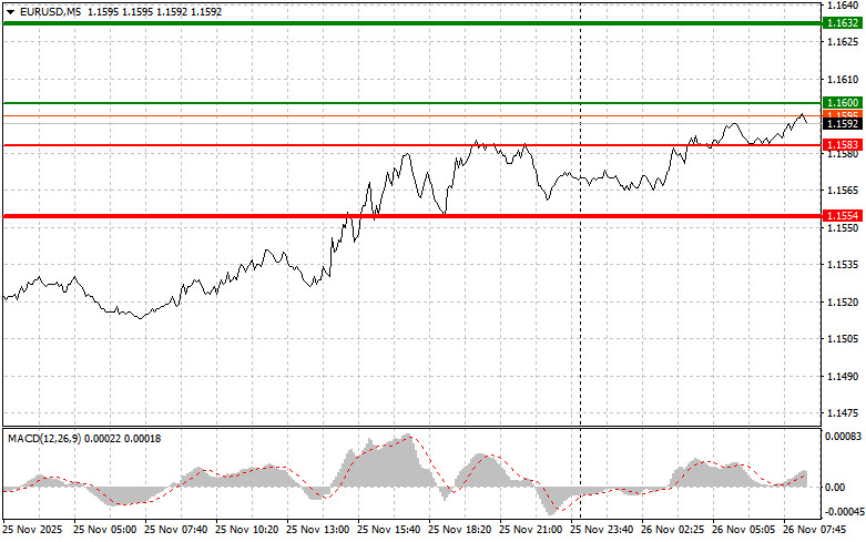 বাই সিগন্যাল পরিকল্পনা #1: আজ যখন ইউরোর মূল্য 1.1632-এর লেভেলে বৃদ্ধির লক্ষ্যে 1.1600-এর (চার্টে সবুজ লাইন দ্বারা চিহ্নিত) লেভেলে পৌঁছাবে, তখন আপনি ইউরোর লং পজিশন ওপেন করতে পারেন। মূল্য 1.1632-এর লেভেলে গেলে, আমি লং পজিশন ক্লোজ করার পরিকল্পনা করছি এবং এন্ট্রি পয়েন্ট থেকে বিপরীত দিকে 30-35 পিপসের মুভমেন্টের উপর নির্ভর করে ইউরোর শর্ট পজিশন ওপেন করব। আজ শুধুমাত্র আসন্ন প্রতিবেদনের ইতিবাচক ফলাফল প্রকাশিত হলে ইউরোর দর বৃদ্ধি পেতে পারে। গুরুত্বপূর্ণ: এই পেয়ার কেনার আগে, নিশ্চিত করুন যে MACD সূচকটি শূন্যের উপরে রয়েছে এবং সেখান থেকে উপরের দিকে উঠতে শুরু করেছে। পরিকল্পনা #2: আজ MACD সূচকটি ওভারসোল্ড জোনে থাকাকালীন সময়ে 1.1583-এর লেভেলে মূল্যের পরপর দুটি টেস্টের ক্ষেত্রে আমি ইউরোর লং পজিশন ওপেন করার পরিকল্পনা করছি। এটি এই পেয়ারের মূল্যের নিম্নমুখী হওয়ার সম্ভাবনাকে সীমিত করবে এবং বাজারদরকে বিপরীতমুখী করে ঊর্ধ্বমুখী করবে। আমরা 1.1600 এবং 1.1632-এর বিপরীতমুখী লেভেলের দিকে এই পেয়ারের দর বৃদ্ধির প্রত্যাশা করতে পারি।