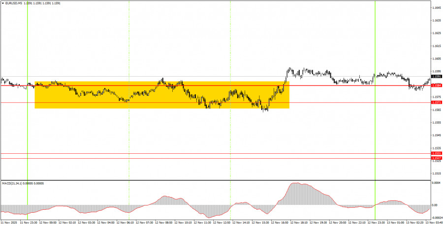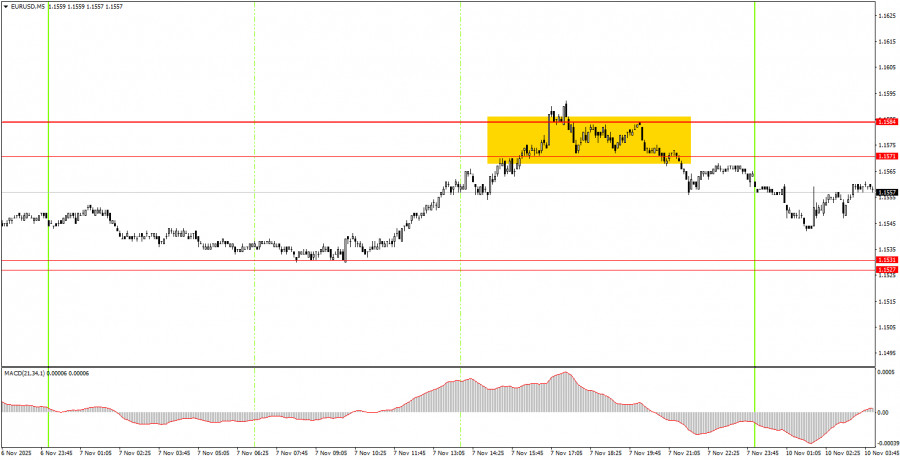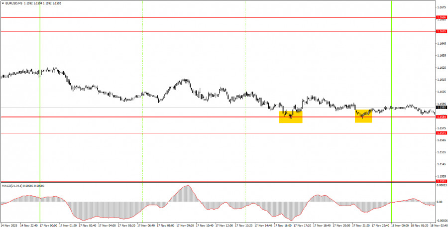 EUR/USD পেয়ারের 5M চার্ট সোমবার ৫-মিনিটের টাইমফ্রেমে দুটি ট্রেডিং সিগন্যাল গঠিত হয়েছে। দিনের শেষভাগে, এই পেয়ারের মূল্য 1.1584 লেভেলে পৌঁছায় এবং এই লেভেল থেকে দুইবার বাউন্স করে—যদিও এই "বাউন্স" শব্দটি ব্যবহার করাটা একটু বেশি মনে হতে পারে। তবুও, আজ এই পেয়ারের মূল্য আবারও এই লেভেল বা পুরো 1.1571–1.1584 এরিয়া থেকে বাউন্স করে প্রায় ৩০-৪০ পিপস পর্যন্ত ঊর্ধ্বমুখী মুভমেন্ট প্রদর্শন করতে পারে।