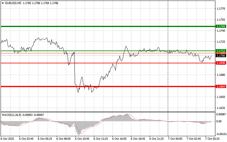 বাই সিগন্যাল পরিকল্পনা #1: আজ যখন ইউরোর মূল্য 1.1745-এর লেভেলে বৃদ্ধির লক্ষ্যে 1.1712-এর (চার্টে সবুজ লাইন দ্বারা চিহ্নিত) লেভেলে পৌঁছাবে, তখন আপনি ইউরো কিনতে পারেন। মূল্য 1.1745-এর লেভেলে গেলে, আমি লং পজিশন ক্লোজ করার পরিকল্পনা করছি এবং এন্ট্রি পয়েন্ট থেকে বিপরীত দিকে 30-35 পিপসের মুভমেন্টের উপর নির্ভর করে ইউরোর শর্ট পজিশন ওপেন করব। গুরুত্বপূর্ণ: এই পেয়ার কেনার আগে, নিশ্চিত করুন যে MACD সূচকটি শূন্যের উপরে রয়েছে এবং সেখান থেকে উপরের দিকে উঠতে শুরু করেছে। পরিকল্পনা #2: আজ MACD সূচকটি ওভারসোল্ড জোনে থাকাকালীন সময়ে 1.1696-এর লেভেলে মূল্যের পরপর দুটি টেস্টের ক্ষেত্রে আমি ইউরো কেনার পরিকল্পনা করছি। এটি এই পেয়ারের মূল্যের নিম্নমুখী হওয়ার সম্ভাবনাকে সীমিত করবে এবং বাজারদরকে বিপরীতমুখী করে ঊর্ধ্বমুখী করবে। আমরা 1.1712 এবং 1.1745-এর বিপরীতমুখী লেভেলের দিকে এই পেয়ারের দর বৃদ্ধির প্রত্যাশা করতে পারি। সেল সিগন্যাল