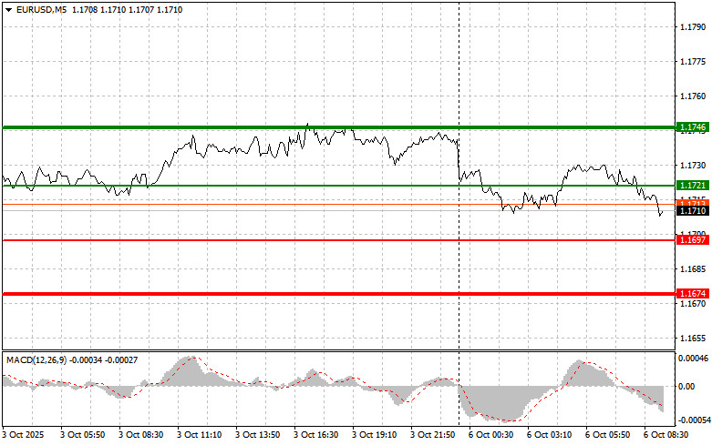 বাই সিগন্যাল পরিকল্পনা 1: আজ যখন ইউরোর মূল্য 1.1746-এর লেভেলে বৃদ্ধির লক্ষ্যে 1.1721-এর (চার্টে সবুজ লাইন দ্বারা চিহ্নিত) লেভেলে পৌঁছাবে, তখন আপনি ইউরো কিনতে পারেন। মূল্য 1.1746-এর লেভেলে গেলে, আমি লং পজিশন ক্লোজ করার পরিকল্পনা করছি এবং এন্ট্রি পয়েন্ট থেকে বিপরীত দিকে 30-35 পিপসের মুভমেন্টের উপর নির্ভর করে ইউরোর শর্ট পজিশন ওপেন করব। আজ আসন্ন প্রতিবেদনের বেশ ইতিবাচক ফলাফল প্রকাশিত হলে ইউরো ক্রয় করা যেতে পারে। গুরুত্বপূর্ণ: এই পেয়ার কেনার আগে, নিশ্চিত করুন যে MACD সূচকটি শূন্যের উপরে রয়েছে এবং সেখান থেকে উপরের দিকে উঠতে শুরু করেছে। পরিকল্পনা 2: আজ MACD সূচকটি ওভারসোল্ড জোনে থাকাকালীন সময়ে 1.1697-এর লেভেলে মূল্যের পরপর দুটি টেস্টের ক্ষেত্রে আমি ইউরো কেনার পরিকল্পনা করছি। এটি এই পেয়ারের মূল্যের নিম্নমুখী হওয়ার সম্ভাবনাকে সীমিত করবে এবং বাজারদরকে বিপরীতমুখী করে ঊর্ধ্বমুখী করবে। আমরা 1.1721 এবং 1.1746-এর বিপরীতমুখী লেভেলের দিকে এই পেয়ারের দর বৃদ্ধির প্রত্যাশা করতে পারি।