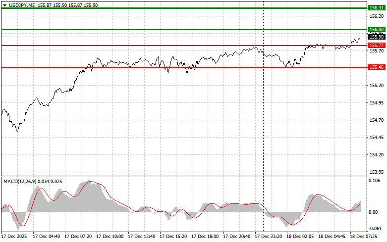 সেল সিগন্যাল পরিকল্পনা 1: আজ এই পেয়ারের মূল্য শুধুমাত্র 155.77-এর (চার্টে হালকা লাল লাইন) লেভেল ব্রেক করে নিম্নমুখী হওয়ার পর USD/JPY পেয়ার বিক্রি করার পরিকল্পনা করছি, যা এই পেয়ারের দ্রুত দরপতনের দিকে নিয়ে যাবে। বিক্রেতাদের জন্য মূল লক্ষ্যমাত্রা হবে 155.46-এর লেভেল (গাঢ় লাল লাইন), যেখানে আমি শর্ট পজিশন ক্লোজ করতে যাচ্ছি এবং অবিলম্বে বিপরীত দিকে লং পজিশন ওপেন করতে যাচ্ছি, সেই লেভেল থেকে বিপরীত দিকে 20-25 পিপস রিবাউন্ডের আশা করছি। যতটা সম্ভব উচ্চ লেভেলে থাকা অবস্থায় এই পেয়ার বিক্রি করা উচিত হবে। গুরুত্বপূর্ণ! এই পেয়ার বিক্রি করার আগে, নিশ্চিত করুন যে MACD সূচকটি শূন্যের নিচে রয়েছে এবং সবেমাত্র শূন্যের নিচে নামতে শুরু করেছে। পরিকল্পনা 2: আজ MACD সূচকটি ওভারবট জোনে থাকাকালীন সময় মূল্য পরপর দুইবার 156.00-এর লেভেলে পৌঁছানোর ক্ষেত্রে আমি USD/JPY পেয়ার বিক্রি করার পরিকল্পনা করছি। এটি এই পেয়ারের মূল্যের ঊর্ধ্বমুখী হওয়ার সম্ভাবনাকে সীমিত করবে এবং বাজারদরকে বিপরীতমুখী করে নিম্নমুখী করবে। আমরা 155.77 এবং 155.46-এর বিপরীতমুখী লেভেলের দিকে এই পেয়ারের দরপতনের আশা করতে পারি।