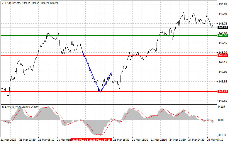 জাপানী ইয়েনের ট্রেডিংয়ের পর্যালোচনা এবং টিপস যখন MACD সূচকটি ঠিক শূন্যের নিচের দিকে নামা শুরু করেছিল, তখন এই পেয়ারের মূল্য 149.26 এর লেভেল টেস্ট করেছিল, যা ডলার বিক্রি করার জন্য একটি সঠিক এন্ট্রি পয়েন্ট নিশ্চিত করেছিল। এর ফলস্বরূপ, এই পেয়ারের মূল্য 148.69-এর টার্গেট লেভেলের দিকে নেমে গিয়েছিল। এরপর এই লেভেল থেকে রিবাউন্ডের মুভমেন্টে এই পেয়ার ক্রয় করার মাধ্যমে ট্রেডাররা প্রায় 30 পিপস লাভ করতে সক্ষম হন। আজকের খবরে জানা যায় যে জাপানের উৎপাদন খাতের PMI এবং পরিষেবা খাতের PMI-এর ফলাফল অর্থনীতিবিদদের পূর্বাভাসের তুলনায় উল্লেখযোগ্যভাবে নেতিবাচক ছিল, যার ফলে ইয়েনের ব্যাপক বিক্রি এবং ডলারের মূল্যের শক্তিশালী ঊর্ধ্বমুখী মুভমেন্ট দেখা গেছে। দুর্বল অর্থনৈতিক প্রতিবেদন প্রকাশের পর বিনিয়োগকারীরা সঙ্গে সঙ্গে প্রতিক্রিয়া দেখান — তারা জাপানের অর্থনৈতিক প্রবৃদ্ধি মন্থর হয়ে যাওয়ার আশঙ্কায় ইয়েনের চাহিদা হ্রাস পাওয়ার সম্ভাবনা থেকে এটিতে বিনিয়োগ সরে আসেন। ইয়েনের ওপর আরেকটি বড় চাপ এসেছে এই প্রত্যাশা থেকে যে ফেডারেল রিজার্ভ হকিশ বা কঠোর মুদ্রানীতি অব্যাহত রাখবে। সাম্প্রতিক সামষ্টিক অর্থনৈতিক প্রতিবেদনের ফলাফলের সমর্থনে যুক্তরাষ্ট্রের অর্থনৈতিক স্থিতিশীলতা নিয়ে বিনিয়োগকারীদের আত্মবিশ্বাস বাড়ছে, যার ফলে তারা ডলারের দিকে ঝুঁকছেন এবং এটি আরও আকর্ষণীয় সম্পদে পরিণত হয়েছে। তবে, এই পরিস্থিতির মধ্যেও এখন আর জাপান ও যুক্তরাষ্ট্রের মুদ্রানীতির মধ্যে উল্লেখযোগ্য পার্থক্য নেই। ব্যাংক অফ জাপান এখনো সুদের হার বৃদ্ধির দিকে ঝুঁকছে, তাই ইয়েনের বিপরীতে ডলারের মূল্যের বর্তমান ঊর্ধ্বমুখী প্রবণতা খুব তাড়াতাড়ি শেষ হয়ে যেতে পারে — বিশেষ করে জাপানি কেন্দ্রীয় ব্যাংকের পক্ষ থেকে ভবিষ্যতে আরও কঠোর মুদ্রানীতির ইঙ্গিত দেওয়ার পরিপ্রেক্ষিতে। দৈনিক কৌশলের ক্ষেত্রে আমি মূলত পরিকল্পনা #1 এবং #2 বাস্তবায়নের ওপর গুরুত্ব দেব।