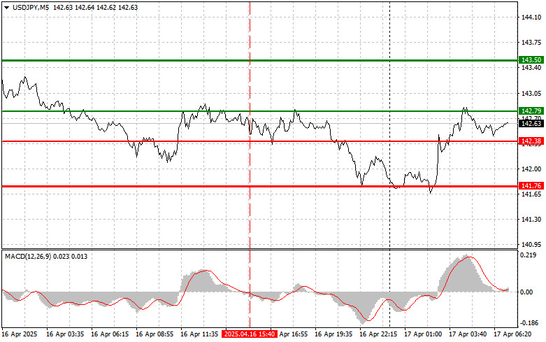 সেল সিগন্যাল পরিকল্পনা #1: আজ এই পেয়ারের মূল্য 142.38-এর (চার্টে লাল লাইন) লেভেল ব্রেক করে নিচের দিকে যাওয়ার পর USD/JPY পেয়ার বিক্রি করার পরিকল্পনা করছি, যা এই পেয়ারের দ্রুত দরপতনের দিকে নিয়ে যাবে। বিক্রেতাদের জন্য মূল লক্ষ্য হবে 141.76-এর লেভেল, যেখানে আমি শর্ট পজিশন ক্লোজ করতে যাচ্ছি এবং অবিলম্বে বিপরীত দিকে লং পজিশন ওপেন করতে যাচ্ছি, সেই লেভেল থেকে বিপরীত দিকে 20-25 পিপস বাউন্সের আশা করছি। আজ যেকোন সময় এই পেয়ারের মূল্যের নিম্নমুখী প্রবণতা ফিরে আসতে পারে। গুরুত্বপূর্ণ! এই পেয়ার বিক্রি করার আগে, নিশ্চিত করুন যে MACD সূচকটি শূন্যের নিচে রয়েছে এবং সবেমাত্র শূন্যের নিচে নামতে শুরু করেছে। পরিকল্পনা #2: আজ MACD সূচকটি ওভারবট জোনে থাকাকালীন সময়ে 142.79-এর লেভেলে পরপর দুটি টেস্টের ক্ষেত্রে আমি USD/JPY পেয়ার বিক্রি করার পরিকল্পনা করছি। এটি এই পেয়ারের মূল্যের ঊর্ধ্বমুখী হওয়ার সম্ভাবনাকে সীমিত করবে এবং বাজারদরকে বিপরীতমুখী করে নিম্নমুখী করবে। আমরা 142.38 এবং 141.76-এর বিপরীতমুখী লেভেলের দিকে এই পেয়ারের দরপতনের আশা করতে পারি।