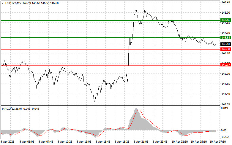 বাই সিগন্যাল পরিকল্পনা #1: আজ এই পেয়ারের মূল্য 147.66-এর (চার্টে গাঢ় সবুজ লাইন) লেভেলে বৃদ্ধির লক্ষ্যে 146.88-এর (চার্টে সবুজ লাইন) এন্ট্রি পয়েন্টে পৌঁছালে আমি USD/JPY পেয়ার কেনার পরিকল্পনা করছি। এই পেয়ারের মূল্য প্রায় 147.66-এর লেভেলে পৌঁছালে, আমি লং পজিশন ক্লোজ করব এবং বিপরীত দিকে শর্ট পজিশন ওপেন করব (এই লেভেল থেকে বিপরীত দিকে 30-35 পিপস মুভমেন্টের প্রত্যাশা করছি)। USD/JPY পেয়ারের মূল্যের কারেকশন এবং উল্লেখযোগ্য দরপতনের সময় এই পেয়ার ক্রয় করা উচিত হবে। গুরুত্বপূর্ণ! এই পেয়ার কেনার আগে, নিশ্চিত করুন যে MACD সূচকটি শূন্যের উপরে রয়েছে এবং শূন্যের উপরে উঠতে শুরু করেছে। পরিকল্পনা #2: আজ MACD সূচকটি ওভারসোল্ড জোনে থাকাকালীন সময়ে 146.38-এর লেভেলে মূল্যের পরপর দুটি টেস্টের ক্ষেত্রে আমি USD/JPY পেয়ার কেনার পরিকল্পনা করছি। এটি এই পেয়ারের মূল্যের নিম্নমুখী হওয়ার সম্ভাবনাকে সীমিত করবে এবং বাজারদরকে বিপরীতমুখী করে ঊর্ধ্বমুখী দিকে নিয়ে যাবে। আমরা 146.88 এবং 147.66-এর বিপরীতমুখী লেভেলের দিকে এই পেয়ারের দর বৃদ্ধির প্রত্যাশা করতে পারি। সেল সিগন্যাল পরিকল্পনা #1: আজ এই পেয়ারের মূল্য 146.38-এর (চার্টে লাল লাইন) লেভেল ব্রেক করে নিচের দিকে যাওয়ার পর USD/JPY পেয়ার বিক্রি করার পরিকল্পনা করছি, যা এই পেয়ারের দ্রুত দরপতনের দিকে নিয়ে যাবে। বিক্রেতাদের জন্য মূল লক্ষ্য হবে 145.67-এর লেভেল, যেখানে আমি শর্ট পজিশন ক্লোজ করতে যাচ্ছি এবং অবিলম্বে বিপরীত দিকে লং পজিশন ওপেন করতে যাচ্ছি, সেই লেভেল থেকে বিপরীত দিকে 20-25 পিপস বাউন্সের আশা করছি। যেকোন সময় এই পেয়ারের মূল্যের নিম্নমুখী প্রবণতা ফিরে আসতে পারে। গুরুত্বপূর্ণ! এই পেয়ার বিক্রি করার আগে, নিশ্চিত করুন যে MACD সূচকটি শূন্যের নিচে রয়েছে এবং সবেমাত্র শূন্যের নিচে নামতে শুরু করেছে। পরিকল্পনা #2: আজ MACD সূচকটি ওভারবট জোনে থাকাকালীন সময়ে 146.88-এর লেভেলে পরপর দুটি টেস্টের ক্ষেত্রে আমি USD/JPY পেয়ার বিক্রি করার পরিকল্পনা করছি। এটি এই পেয়ারের মূল্যের ঊর্ধ্বমুখী হওয়ার সম্ভাবনাকে সীমিত করবে এবং বাজারদরকে বিপরীতমুখী করে নিম্নমুখী করবে। আমরা 146.38 এবং 145.67-এর বিপরীতমুখী লেভেলের দিকে এই পেয়ারের দরপতনের আশা করতে পারি।