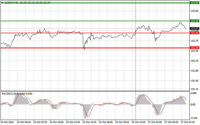 বাই সিগন্যাল পরিকল্পনা 1: আজ এই পেয়ারের মূল্য 153.24-এর (চার্টে গাঢ় সবুজ লাইন) লেভেলে বৃদ্ধির লক্ষ্যে 152.58-এর (চার্টে সবুজ লাইন) এন্ট্রি পয়েন্টে পৌঁছালে আমি USD/JPY পেয়ার কেনার পরিকল্পনা করছি। এই পেয়ারের মূল্য প্রায় 153.24-এর লেভেলে পৌঁছালে, আমি লং পজিশন ক্লোজ করব এবং বিপরীত দিকে শর্ট পজিশন ওপেন করব (এই লেভেল থেকে বিপরীত দিকে 30-35 পিপস মুভমেন্টের প্রত্যাশা করছি)। USD/JPY পেয়ারের দরপতন এবং উল্লেখযোগ্য পুলব্যাকের সময় এই পেয়ার ক্রয় করা উচিত হবে। গুরুত্বপূর্ণ! এই পেয়ার কেনার আগে, নিশ্চিত করুন যে MACD সূচকটি শূন্যের উপরে রয়েছে এবং শূন্যের উপরে উঠতে শুরু করেছে। পরিকল্পনা 2: আজ MACD সূচকটি ওভারসোল্ড জোনে থাকাকালীন সময়ে 152.26-এর লেভেলে মূল্যের পরপর দুটি টেস্টের ক্ষেত্রে আমি USD/JPY পেয়ার কেনার পরিকল্পনা করছি। এটি এই পেয়ারের মূল্যের নিম্নমুখী হওয়ার সম্ভাবনাকে সীমিত করবে এবং বাজারদরকে বিপরীতমুখী করে ঊর্ধ্বমুখী দিকে নিয়ে যাবে। আমরা 152.58 এবং 153.24-এর বিপরীতমুখী লেভেলের দিকে এই পেয়ারের দর বৃদ্ধির প্রত্যাশা করতে পারি।