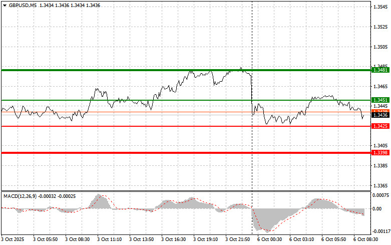 GBP/USD পেয়ারের 5M চার্ট 5-মিনিটের টাইমফ্রেমে, শুক্রবার একটি অত্যন্ত কার্যকর সেল সিগন্যাল গঠিত হয়েছিল—ঠিক সেই সময়ে যখন ট্রেডাররা ঊর্ধ্বমুখী মুভমেন্টের আশা করছিলেন। তবুও, সেই সিগন্যাল শর্ট পজিশনে এন্ট্রি নেওয়ার সুযোগ করে দিয়েছিল। মার্কিন সেশন শুরুর সময়েই এই পেয়ারের মূল্য 1.3466–1.3475 এর নিকটতম লক্ষ্যমাত্রায় পৌঁছে গিয়েছিল, ফলে মুনাফা করা সম্ভব হয়েছিল। এই জোন থেকে বাউন্সের ফলে বাই এন্ট্রির সম্ভাবনার ইঙ্গিতও পাওয়া গিয়েছিল, কিন্তু সেই সিগন্যালটি ভুল প্রমাণিত হয়।