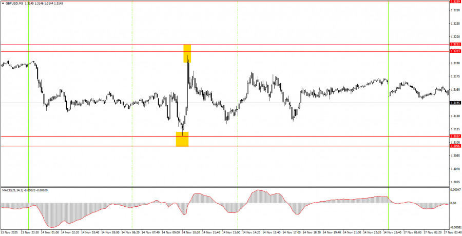 GBP/USD পেয়ারের 5M চার্ট ৫-মিনিটের টাইমফ্রেমে, সোমবার এই পেয়ারের মূল্যের মুভমেন্টের ধরন বেশ স্পষ্টভাবে দেখা গেছে। 1.3096-1.3107 এরিয়া, যা বর্তমান সাইডওয়েজ চ্যানেলের উপরের সীমা হিসেবে কাজ করছে, সেখানে একাধিক ট্রেডিং সিগন্যাল গঠিত করেছিল। তবে, আমরা যেমনটি দেখেছি, মূল্য এই লেভেল থেকে বাউন্সও করেনি, এবং তা ব্রেকও করেনি। অর্থাৎ, সোমবার আমরা একটি রেঞ্জের ভেতর আবার আরও একটি রেঞ্জভিত্তিক মুভমেন্ট দেখতে পেয়েছি — যা একপ্রকার ডাবল রেঞ্জ কন্ডিশন বলা যায়।