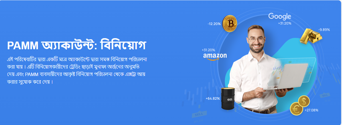 ফরেক্স মার্কেটে বিনিয়োগের সবচেয়ে কম ঝুঁকিপূর্ণ উপায় হল ইন্সটাফরেক্সের তৈরি প্যাম সিস্টেম। এই সিস্টেমে, একজন বিনিয়োগকারী কোনও নির্দিষ্ট ট্রেডার নির্বাচন করতে পারেন, তার ট্রেডিং অ্যাকাউন্টে বিনিয়োগ করতে পারেন এবং তার মুনাফার অংশ গ্রহণ করতে পারেন। ম্যানেজিং ট্রেডার তালিকা সম্পূর্ণ স্বচ্ছ এবং প্যাম মনিটরিং পৃষ্ঠায় উপস্থাপন করা হয়। ছোট বিনিয়োগ করার সুবিধার জন্য, একজন বিনিয়োগকারী স্বল্প সময়ের মধ্যে অনেক ম্যানেজিং ট্রেডার পরীক্ষা করতে পারেন এবং সবচেয়ে কার্যকর প্যাম অ্যাকাউন্ট নির্বাচন করতে পারেন।