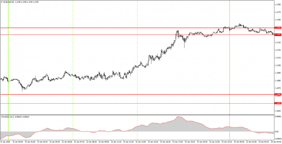 বৃহস্পতিবারের ট্রেডিংয়ের পর্যালোচনা: EUR/USD পেয়ারের 1-ঘন্টার চার্ট বৃহস্পতিবার প্রায় সারাদিন ঊর্ধ্বমুখী প্রবণতার সাথে EUR/USD পেয়ারের ট্রেডিং পরিলক্ষিত হয়েছে। দিনের শেষ নাগাদ ইউরোর দর 1.1754 লেভেল ফিরে আসে, যা সাত মাসব্যাপী দৃশ্যমান সাইডওয়েজ চ্যানেল 1.1400–1.1830-এর উপর সীমার খুব কাছাকাছি অবস্থিত। অনেক ট্রেডারের কাছেই ইউরোর দর বৃদ্ধির কারণ নাও স্পষ্ট হতে পারে। গতকাল জানা যায় যে ট্রাম্প ইউরোপ ও যুক্তরাজ্যের ওপর আরোপিত শুল্কগুলো বাতিল করেছেন, যা পহেলা ফেব্রুয়ারি থেকে কার্যকর হওয়ার কথা ছিল। মার্কিন যুক্তরাষ্ট্র কর্তৃক গ্রিনল্যান্ড অধিগ্রহণের পরিকল্পনার বিরোধিতা করায় এই শুল্ক আরোপের হুমকি দেয়া হয়েছিল। এখন মনে হচ্ছে ভূরাজনৈতিক চাপ হ্রাস পেয়েছে এবং ইইউ ও মার্কিন যুক্তরাষ্ট্রের মধ্যে নতুন করে কোনো বাণিজ্যযুদ্ধ শুরু হবে না বলে আশা করা যায়। তবুও, সারাদিনই ডলারের দরপতন হচ্ছে। গতকাল মার্কিন যুক্তরাষ্ট্রে প্রকাশিত গত বছরের তৃতীয় প্রান্তিকের জিডিপি প্রতিবেদন একরকম উপেক্ষাই করা হয়েছে — জিডিপি প্রবৃদ্ধির হার পূর্বাভাস অতিক্রম করেছিল, তবে ট্রেডাররা এটি তেমনভাবে বিবেচনায় নেয়নি। সমস্যা কী? সমস্যা হলো ট্রেডাররা ট্রাম্পকে কেন্দ্র করে প্রকাশিত "সংবাদগুলোর" প্রতিক্রিয়া দিতে দিতে ক্লান্ত এবং মার্কিন শ্রমবাজারের দুর্বল পরিস্থিতি বিবেচনায় নিয়ে কম সংখ্যক মানুষই বর্তমান মার্কিন অর্থনৈতিক প্রবৃদ্ধির হারকে সত্যি বলে মনে করে। ট্রাম্পের গৃহীত অবস্থানের কারণে ডলারের দরপতন হওয়ার সম্ভাবনাই বেশি। সাত মাসব্যাপী দৃশ্যমান ফ্ল্যাট রেঞ্জ মূলত ট্রেডারদের পক্ষ থেকে মার্কিন ডলারের জন্য একটি উপহার।