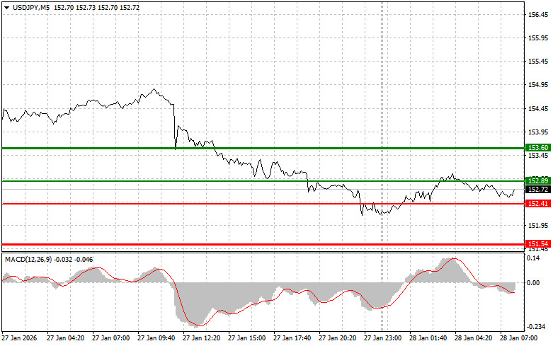 সেল সিগন্যাল পরিকল্পনা #1: আজ এই পেয়ারের মূল্য শুধুমাত্র 152.41-এর (চার্টে হালকা লাল লাইন) লেভেলে পৌঁছানোর পর USD/JPY পেয়ার বিক্রি করার পরিকল্পনা করছি, যা এই পেয়ারের দ্রুত দরপতনের দিকে নিয়ে যাবে। বিক্রেতাদের জন্য মূল লক্ষ্যমাত্রা হবে 151.54-এর লেভেল (গাঢ় লাল লাইন), যেখানে আমি শর্ট পজিশন ক্লোজ করতে যাচ্ছি এবং অবিলম্বে বিপরীত দিকে লং পজিশন ওপেন করতে যাচ্ছি, সেই লেভেল থেকে বিপরীত দিকে 20-25 পিপস রিবাউন্ডের আশা করছি। যতটা সম্ভব উচ্চ লেভেলে থাকা অবস্থায় এই পেয়ার বিক্রি করা উচিত হবে। গুরুত্বপূর্ণ! এই পেয়ার বিক্রি করার আগে, নিশ্চিত করুন যে MACD সূচকটি শূন্যের নিচে রয়েছে এবং সবেমাত্র শূন্যের নিচে নামতে শুরু করেছে। পরিকল্পনা #2: আজ MACD সূচকটি ওভারবট জোনে থাকাকালীন সময় মূল্য পরপর দুইবার 152.89-এর লেভেল টেস্টের ক্ষেত্রে আমি USD/JPY পেয়ার বিক্রি করার পরিকল্পনা করছি। এটি এই পেয়ারের মূল্যের ঊর্ধ্বমুখী হওয়ার সম্ভাবনাকে সীমিত করবে এবং মূল্যকে বিপরীতমুখী করে নিম্নমুখী করবে। আমরা 152.41 এবং 151.54-এর বিপরীতমুখী লেভেলের দিকে এই পেয়ারের দরপতনের আশা করতে পারি।