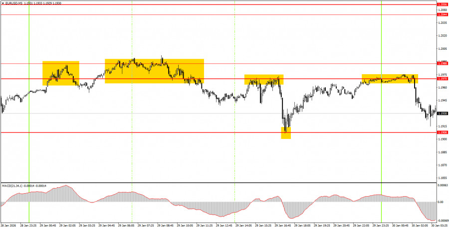 বৃহস্পতিবারের ট্রেডিংয়ের পর্যালোচনা: EUR/USD পেয়ারের 1-ঘন্টার চার্ট বৃহস্পতিবার প্রায় সারাদিন ঊর্ধ্বমুখী প্রবণতার সাথে EUR/USD পেয়ারের ট্রেডিং পরিলক্ষিত হয়েছে। দিনের শেষ নাগাদ ইউরোর দর 1.1754 লেভেল ফিরে আসে, যা সাত মাসব্যাপী দৃশ্যমান সাইডওয়েজ চ্যানেল 1.1400–1.1830-এর উপর সীমার খুব কাছাকাছি অবস্থিত। অনেক ট্রেডারের কাছেই ইউরোর দর বৃদ্ধির কারণ নাও স্পষ্ট হতে পারে। গতকাল জানা যায় যে ট্রাম্প ইউরোপ ও যুক্তরাজ্যের ওপর আরোপিত শুল্কগুলো বাতিল করেছেন, যা পহেলা ফেব্রুয়ারি থেকে কার্যকর হওয়ার কথা ছিল। মার্কিন যুক্তরাষ্ট্র কর্তৃক গ্রিনল্যান্ড অধিগ্রহণের পরিকল্পনার বিরোধিতা করায় এই শুল্ক আরোপের হুমকি দেয়া হয়েছিল। এখন মনে হচ্ছে ভূরাজনৈতিক চাপ হ্রাস পেয়েছে এবং ইইউ ও মার্কিন যুক্তরাষ্ট্রের মধ্যে নতুন করে কোনো বাণিজ্যযুদ্ধ শুরু হবে না বলে আশা করা যায়। তবুও, সারাদিনই ডলারের দরপতন হচ্ছে। গতকাল মার্কিন যুক্তরাষ্ট্রে প্রকাশিত গত বছরের তৃতীয় প্রান্তিকের জিডিপি প্রতিবেদন একরকম উপেক্ষাই করা হয়েছে — জিডিপি প্রবৃদ্ধির হার পূর্বাভাস অতিক্রম করেছিল, তবে ট্রেডাররা এটি তেমনভাবে বিবেচনায় নেয়নি। সমস্যা কী? সমস্যা হলো ট্রেডাররা ট্রাম্পকে কেন্দ্র করে প্রকাশিত "সংবাদগুলোর" প্রতিক্রিয়া দিতে দিতে ক্লান্ত এবং মার্কিন শ্রমবাজারের দুর্বল পরিস্থিতি বিবেচনায় নিয়ে কম সংখ্যক মানুষই বর্তমান মার্কিন অর্থনৈতিক প্রবৃদ্ধির হারকে সত্যি বলে মনে করে। ট্রাম্পের গৃহীত অবস্থানের কারণে ডলারের দরপতন হওয়ার সম্ভাবনাই বেশি। সাত মাসব্যাপী দৃশ্যমান ফ্ল্যাট রেঞ্জ মূলত ট্রেডারদের পক্ষ থেকে মার্কিন ডলারের জন্য একটি উপহার।