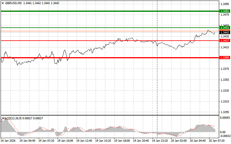 GBP/USD পেয়ারের 5M চার্ট সোমবার ৫-মিনিটের টাইমফ্রেমে একটি বাই ট্রেডিং সিগন্যাল গঠিত হয়, যা মঙ্গলবারও প্রাসঙ্গিক থাকবে। ইউরোপীয় ট্রেডিং সেশনের সময় এই পেয়ারের মূল্য কার্যকরভাবে 1.3437–1.3446 এরিয়া ব্রেক করায় নতুন ট্রেডাররা লং পজিশন ওপেন করার সুযোগ পান। এই মুভমেন্টের লক্ষ্যমাত্রা 1.3529–1.3543 এরিয়ায় নির্ধারণ করা হয়েছে। তবে আমরা মনে করিয়ে দিতে চাই—মার্কেটে তুলনামূলকভাবে স্বল্প মাত্রার অস্থিরতা বিরাজ করবে, যদি না ব্যতিক্রমধর্মী কোনো খবর প্রকাশ পায়। যেমনটি গতকাল ঘটেছিল।