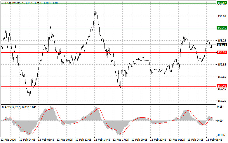 সেল সিগন্যাল পরিকল্পনা #1: আজ এই পেয়ারের মূল্য শুধুমাত্র 153.05-এর (চার্টে হালকা লাল লাইন) লেভেলে পৌঁছানোর পর USD/JPY পেয়ার বিক্রি করার পরিকল্পনা করছি, যা এই পেয়ারের দ্রুত দরপতনের দিকে নিয়ে যাবে। বিক্রেতাদের জন্য মূল লক্ষ্যমাত্রা হবে 152.49-এর লেভেল (গাঢ় লাল লাইন), যেখানে আমি শর্ট পজিশন ক্লোজ করতে যাচ্ছি এবং অবিলম্বে বিপরীত দিকে লং পজিশন ওপেন করতে যাচ্ছি, সেই লেভেল থেকে বিপরীত দিকে 20-25 পিপস রিবাউন্ডের আশা করছি। যতটা সম্ভব উচ্চ লেভেলে থাকা অবস্থায় এই পেয়ার বিক্রি করা উচিত হবে। গুরুত্বপূর্ণ! এই পেয়ার বিক্রি করার আগে, নিশ্চিত করুন যে MACD সূচকটি শূন্যের নিচে রয়েছে এবং সবেমাত্র শূন্যের নিচে নামতে শুরু করেছে। পরিকল্পনা #2: আজ MACD সূচকটি ওভারবট জোনে থাকাকালীন সময় মূল্য পরপর দুইবার 153.45-এর লেভেল টেস্টের ক্ষেত্রে আমি USD/JPY পেয়ার বিক্রি করার পরিকল্পনা করছি। এটি এই পেয়ারের মূল্যের ঊর্ধ্বমুখী হওয়ার সম্ভাবনাকে সীমিত করবে এবং মূল্যকে বিপরীতমুখী করে নিম্নমুখী করবে। আমরা 153.05 এবং 152.49-এর বিপরীতমুখী লেভেলের দিকে এই পেয়ারের দরপতনের আশা করতে পারি।