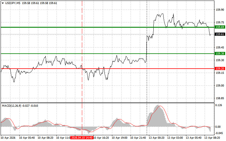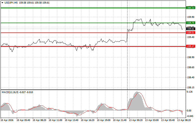সেল সিগন্যাল পরিকল্পনা #1: আজ এই পেয়ারের মূল্য শুধুমাত্র 159.51-এর (চার্টে হালকা লাল লাইন) লেভেলে পৌঁছানোর পর USD/JPY পেয়ার বিক্রি করার পরিকল্পনা করছি, যা এই পেয়ারের দ্রুত দরপতনের দিকে নিয়ে যাবে। বিক্রেতাদের জন্য মূল লক্ষ্যমাত্রা হবে 159.17-এর লেভেল (গাঢ় লাল লাইন), যেখানে আমি শর্ট পজিশন ক্লোজ করতে যাচ্ছি এবং অবিলম্বে বিপরীত দিকে লং পজিশন ওপেন করতে যাচ্ছি, সেই লেভেল থেকে বিপরীত দিকে 20-25 পিপস রিবাউন্ডের আশা করছি। যতটা সম্ভব উচ্চ লেভেলে থাকা অবস্থায় এই পেয়ার বিক্রি করা উচিত হবে। গুরুত্বপূর্ণ! এই পেয়ার বিক্রি করার আগে, নিশ্চিত করুন যে MACD সূচকটি শূন্যের নিচে রয়েছে এবং সবেমাত্র শূন্যের নিচে নামতে শুরু করেছে। পরিকল্পনা #2: আজ MACD সূচকটি ওভারবট জোনে থাকাকালীন সময় মূল্য পরপর দুইবার 159.75-এর লেভেল টেস্টের ক্ষেত্রে আমি USD/JPY পেয়ার বিক্রি করার পরিকল্পনা করছি। এটি এই পেয়ারের মূল্যের ঊর্ধ্বমুখী হওয়ার সম্ভাবনাকে সীমিত করবে এবং মূল্যকে বিপরীতমুখী করে নিম্নমুখী করবে। আমরা 159.51 ও 159.17-এর বিপরীতমুখী লেভেলের দিকে এই পেয়ারের দরপতনের আশা করতে পারি।