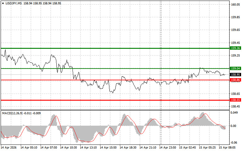 সেল সিগন্যাল পরিকল্পনা #1: আজ এই পেয়ারের মূল্য শুধুমাত্র 158.86-এর (চার্টে হালকা লাল লাইন) লেভেলে পৌঁছানোর পর USD/JPY পেয়ার বিক্রি করার পরিকল্পনা করছি, যা এই পেয়ারের দ্রুত দরপতনের দিকে নিয়ে যাবে। বিক্রেতাদের জন্য মূল লক্ষ্যমাত্রা হবে 158.55-এর লেভেল (গাঢ় লাল লাইন), যেখানে আমি শর্ট পজিশন ক্লোজ করতে যাচ্ছি এবং অবিলম্বে বিপরীত দিকে লং পজিশন ওপেন করতে যাচ্ছি, সেই লেভেল থেকে বিপরীত দিকে 20-25 পিপস রিবাউন্ডের আশা করছি। যতটা সম্ভব উচ্চ লেভেলে থাকা অবস্থায় এই পেয়ার বিক্রি করা উচিত হবে। গুরুত্বপূর্ণ! এই পেয়ার বিক্রি করার আগে, নিশ্চিত করুন যে MACD সূচকটি শূন্যের নিচে রয়েছে এবং সবেমাত্র শূন্যের নিচে নামতে শুরু করেছে। পরিকল্পনা #2: আজ MACD সূচকটি ওভারবট জোনে থাকাকালীন সময় মূল্য পরপর দুইবার 159.04-এর লেভেল টেস্টের ক্ষেত্রে আমি USD/JPY পেয়ার বিক্রি করার পরিকল্পনা করছি। এটি এই পেয়ারের মূল্যের ঊর্ধ্বমুখী হওয়ার সম্ভাবনাকে সীমিত করবে এবং মূল্যকে বিপরীতমুখী করে নিম্নমুখী করবে। আমরা 158.86 এবং 158.55-এর বিপরীতমুখী লেভেলের দিকে এই পেয়ারের দরপতনের আশা করতে পারি।