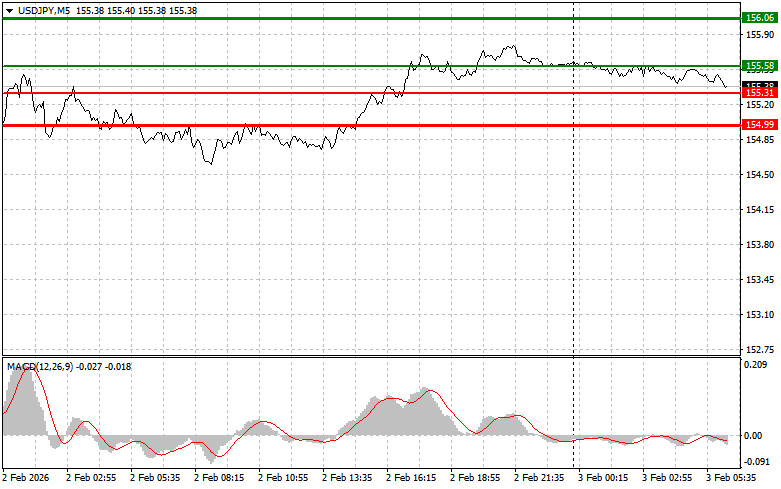 সেল সিগন্যাল পরিকল্পনা #1: আজ এই পেয়ারের মূল্য শুধুমাত্র 155.31-এর (চার্টে হালকা লাল লাইন) লেভেলে পৌঁছানোর পর USD/JPY পেয়ার বিক্রি করার পরিকল্পনা করছি, যা এই পেয়ারের দ্রুত দরপতনের দিকে নিয়ে যাবে। বিক্রেতাদের জন্য মূল লক্ষ্যমাত্রা হবে 154.99-এর লেভেল (গাঢ় লাল লাইন), যেখানে আমি শর্ট পজিশন ক্লোজ করতে যাচ্ছি এবং অবিলম্বে বিপরীত দিকে লং পজিশন ওপেন করতে যাচ্ছি, সেই লেভেল থেকে বিপরীত দিকে 20-25 পিপস রিবাউন্ডের আশা করছি। যতটা সম্ভব উচ্চ লেভেলে থাকা অবস্থায় এই পেয়ার বিক্রি করা উচিত হবে। গুরুত্বপূর্ণ! এই পেয়ার বিক্রি করার আগে, নিশ্চিত করুন যে MACD সূচকটি শূন্যের নিচে রয়েছে এবং সবেমাত্র শূন্যের নিচে নামতে শুরু করেছে। পরিকল্পনা #2: আজ MACD সূচকটি ওভারবট জোনে থাকাকালীন সময় মূল্য পরপর দুইবার 155.58-এর লেভেল টেস্টের ক্ষেত্রে আমি USD/JPY পেয়ার বিক্রি করার পরিকল্পনা করছি। এটি এই পেয়ারের মূল্যের ঊর্ধ্বমুখী হওয়ার সম্ভাবনাকে সীমিত করবে এবং মূল্যকে বিপরীতমুখী করে নিম্নমুখী করবে। আমরা 155.31 এবং 154.99-এর বিপরীতমুখী লেভেলের দিকে এই পেয়ারের দরপতনের আশা করতে পারি।