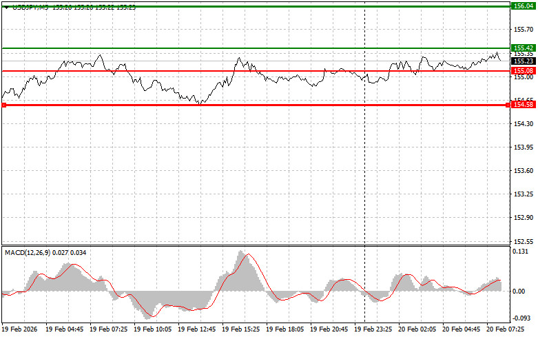 সেল সিগন্যাল পরিকল্পনা #1: আজ এই পেয়ারের মূল্য শুধুমাত্র 155.08-এর (চার্টে হালকা লাল লাইন) লেভেল ব্রেক করে নিম্নমুখী হওয়ার পর USD/JPY পেয়ার বিক্রি করার পরিকল্পনা করছি, যা এই পেয়ারের দ্রুত দরপতনের দিকে নিয়ে যাবে। বিক্রেতাদের জন্য মূল লক্ষ্যমাত্রা হবে 154.58-এর লেভেল (গাঢ় লাল লাইন), যেখানে আমি শর্ট পজিশন ক্লোজ করতে যাচ্ছি এবং অবিলম্বে বিপরীত দিকে লং পজিশন ওপেন করতে যাচ্ছি, সেই লেভেল থেকে বিপরীত দিকে 20-25 পিপস রিবাউন্ডের আশা করছি। যতটা সম্ভব উচ্চ লেভেলে থাকা অবস্থায় এই পেয়ার বিক্রি করা উচিত হবে। গুরুত্বপূর্ণ! এই পেয়ার বিক্রি করার আগে, নিশ্চিত করুন যে MACD সূচকটি শূন্যের নিচে রয়েছে এবং সবেমাত্র শূন্যের নিচে নামতে শুরু করেছে। পরিকল্পনা #2: আজ MACD সূচকটি ওভারবট জোনে থাকাকালীন সময় মূল্য পরপর দুইবার 155.42-এর লেভেল টেস্টের ক্ষেত্রে আমি USD/JPY পেয়ার বিক্রি করার পরিকল্পনা করছি। এটি এই পেয়ারের মূল্যের ঊর্ধ্বমুখী হওয়ার সম্ভাবনাকে সীমিত করবে এবং মূল্যকে বিপরীতমুখী করে নিম্নমুখী করবে। আমরা 155.08 ও 154.58-এর বিপরীতমুখী লেভেলের দিকে এই পেয়ারের দরপতনের আশা করতে পারি।