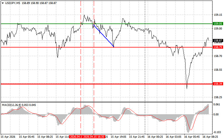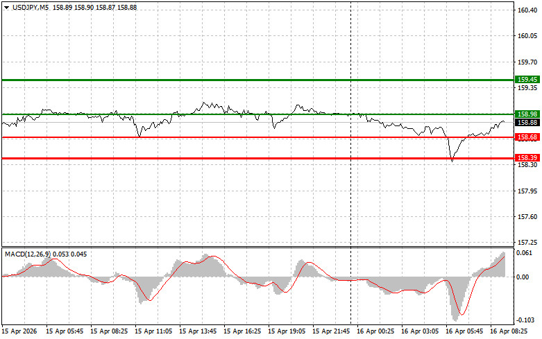 সেল সিগন্যাল পরিকল্পনা #1: আজ এই পেয়ারের মূল্য শুধুমাত্র 158.86-এর (চার্টে হালকা লাল লাইন) লেভেলে পৌঁছানোর পর USD/JPY পেয়ার বিক্রি করার পরিকল্পনা করছি, যা এই পেয়ারের দ্রুত দরপতনের দিকে নিয়ে যাবে। বিক্রেতাদের জন্য মূল লক্ষ্যমাত্রা হবে 158.55-এর লেভেল (গাঢ় লাল লাইন), যেখানে আমি শর্ট পজিশন ক্লোজ করতে যাচ্ছি এবং অবিলম্বে বিপরীত দিকে লং পজিশন ওপেন করতে যাচ্ছি, সেই লেভেল থেকে বিপরীত দিকে 20-25 পিপস রিবাউন্ডের আশা করছি। যতটা সম্ভব উচ্চ লেভেলে থাকা অবস্থায় এই পেয়ার বিক্রি করা উচিত হবে। গুরুত্বপূর্ণ! এই পেয়ার বিক্রি করার আগে, নিশ্চিত করুন যে MACD সূচকটি শূন্যের নিচে রয়েছে এবং সবেমাত্র শূন্যের নিচে নামতে শুরু করেছে। পরিকল্পনা #2: আজ MACD সূচকটি ওভারবট জোনে থাকাকালীন সময় মূল্য পরপর দুইবার 159.04-এর লেভেল টেস্টের ক্ষেত্রে আমি USD/JPY পেয়ার বিক্রি করার পরিকল্পনা করছি। এটি এই পেয়ারের মূল্যের ঊর্ধ্বমুখী হওয়ার সম্ভাবনাকে সীমিত করবে এবং মূল্যকে বিপরীতমুখী করে নিম্নমুখী করবে। আমরা 158.86 এবং 158.55-এর বিপরীতমুখী লেভেলের দিকে এই পেয়ারের দরপতনের আশা করতে পারি।