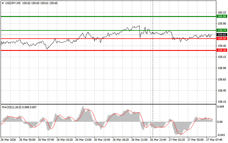 পরিকল্পনা #2: আজ MACD সূচকটি ওভারসোল্ড জোনে থাকাকালীন সময়ে মূল্য পরপর দুইবার 159.56-এর লেভেল টেস্টের ক্ষেত্রে আমি USD/JPY পেয়ার কেনার পরিকল্পনা করছি। এটি এই পেয়ারের মূল্যের নিম্নমুখী হওয়ার সম্ভাবনাকে সীমিত করবে এবং মূল্যকে বিপরীতমুখী করে ঊর্ধ্বমুখী দিকে নিয়ে যাবে। আমরা 159.74 এবং 160.06-এর বিপরীতমুখী লেভেলের দিকে এই পেয়ারের দর বৃদ্ধির প্রত্যাশা করতে পারি।