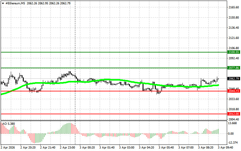 সেল সিগন্যাল পরিকল্পনা #1: ইথেরিয়ামের মূল্য $2,048-এর লেভেলে দরপতনের লক্ষ্যে $2,088-এর এন্ট্রি পয়েন্টে পৌঁছালে আমি ইথেরিয়াম বিক্রি করব। মূল্য $2,048 লেভেলের কাছাকাছি পৌঁছালে আমি শর্ট পজিশন ক্লোজ করব এবং রিবাউন্ডের ক্ষেত্রে অবিলম্বে লং পজিশন ওপেন করব। ব্রেকআউটের ক্ষেত্রে বিক্রির আগে নিশ্চিত করুন যে 50-দিনের মুভিং এভারেজ বর্তমানে মূল্যের উপরে রয়েছে এবং অওসাম অসিলেটর নেগেটিভ জোনে রয়েছে।