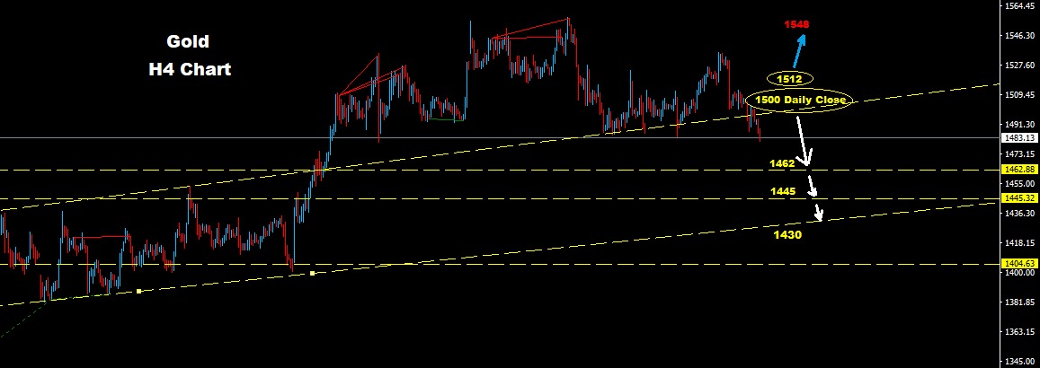 Gold এর H4 টাইমফ্রেমের ​টেকনিক্যাল অ্যানালাইসিস অনুসারে যদি Gold এর মার্কেট প্রাইস 1512 এর উপরে চলে যায় তাহলে মার্কেট ঊর্ধ্বমুখী 1548 পর্যন্ত যেতে পারে। অথবা মার্কেট প্রাইস 1500 থেকে নিছে নেমে যায় তা হলে মার্কেট আরো নিন্মমুখী হবে এবং মার্কেট প্রাইস 1462 লাইন স্পর্শ করে নিছে চলে আসে তাহলে মার্কেট প্রাইস 1445 লাইন বা 1430 লাইনের নিছে চলে যেতে পারে। আপনাদের জন্য শুভ কামনা।